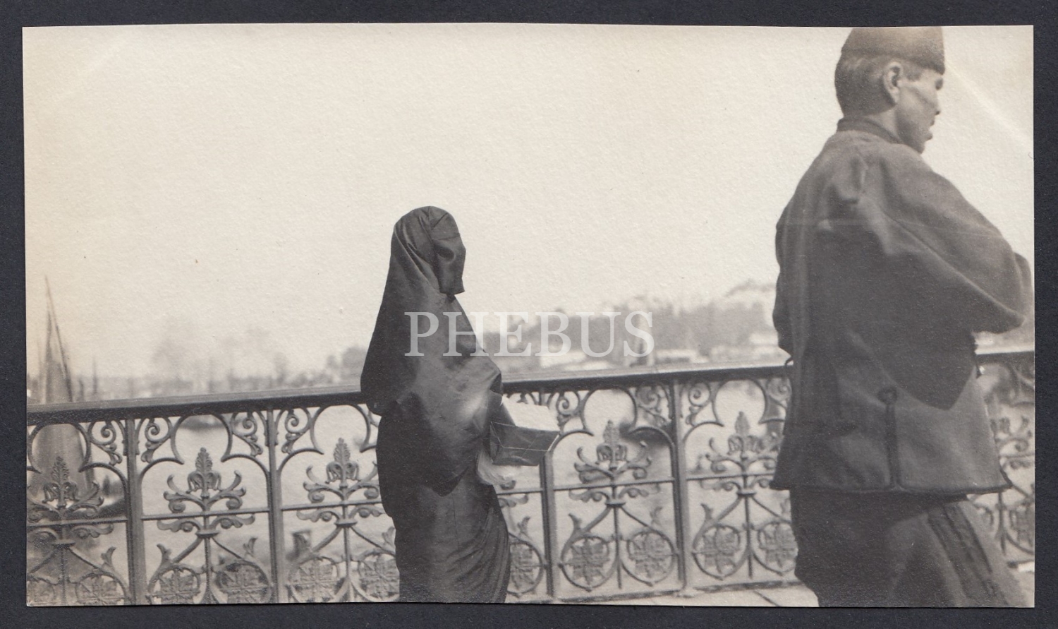 Galata Köprüsü´nde yürüyen feraceli Türk kadını, 13,5x8 cm...