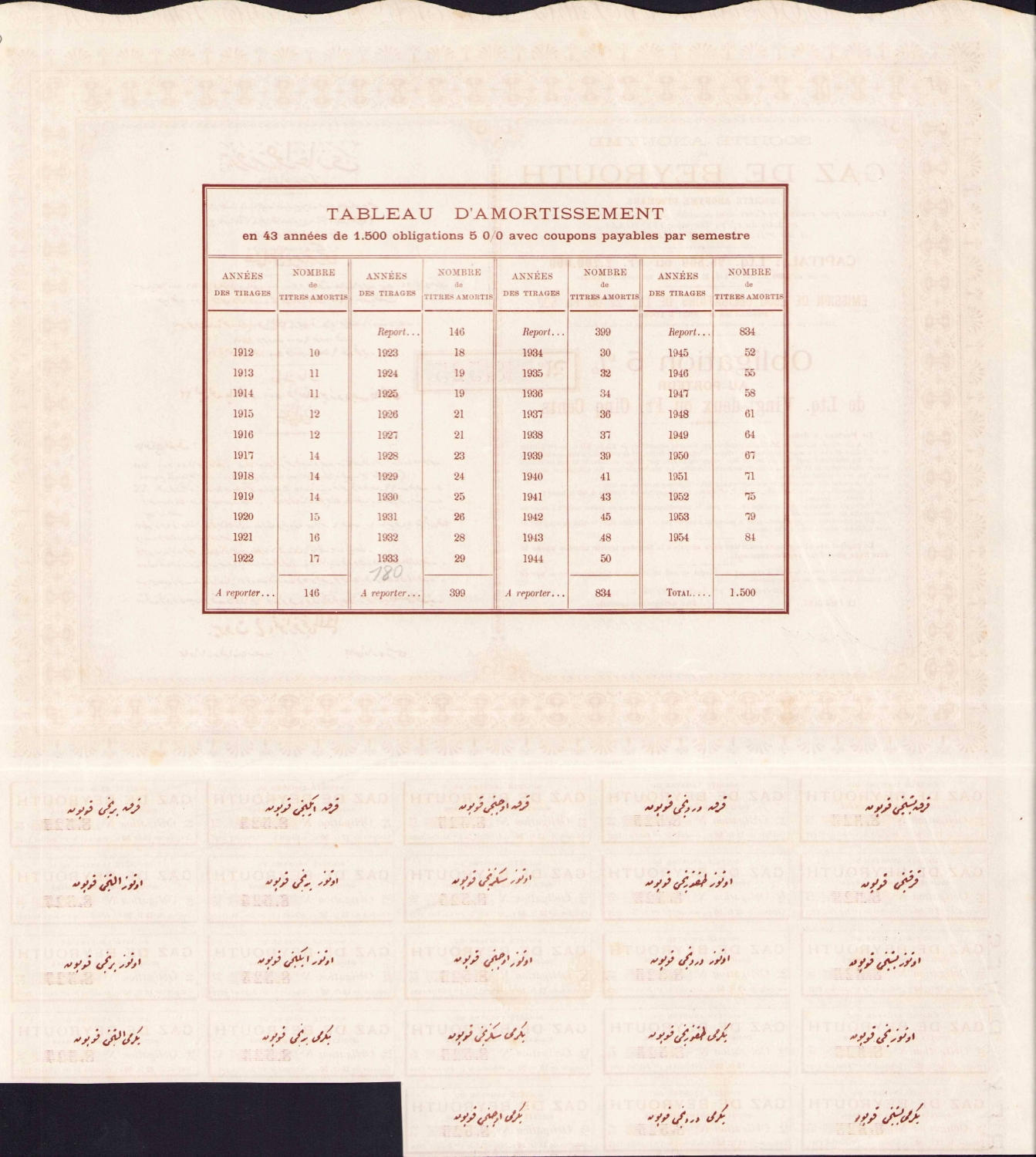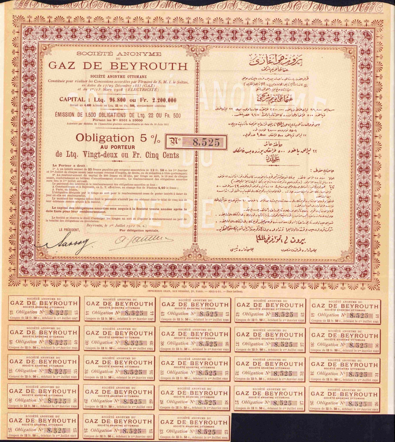 Osmanlıca - Fransızca Beyrut Gazze Osmanlı Anonim Şirketi hisse senedi, 32x32 cm