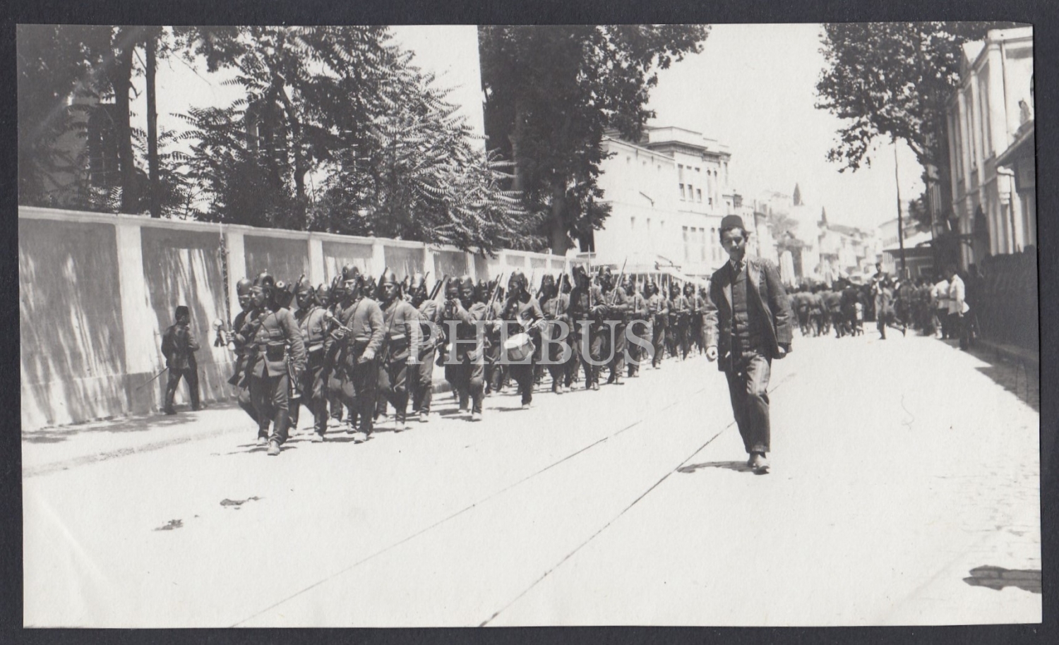 Galata civarında yürüyüş yapan askerler, 14x8 cm...