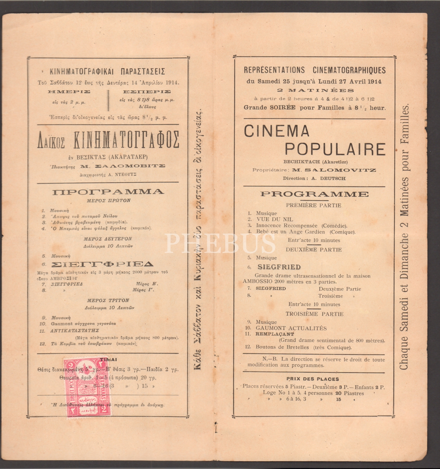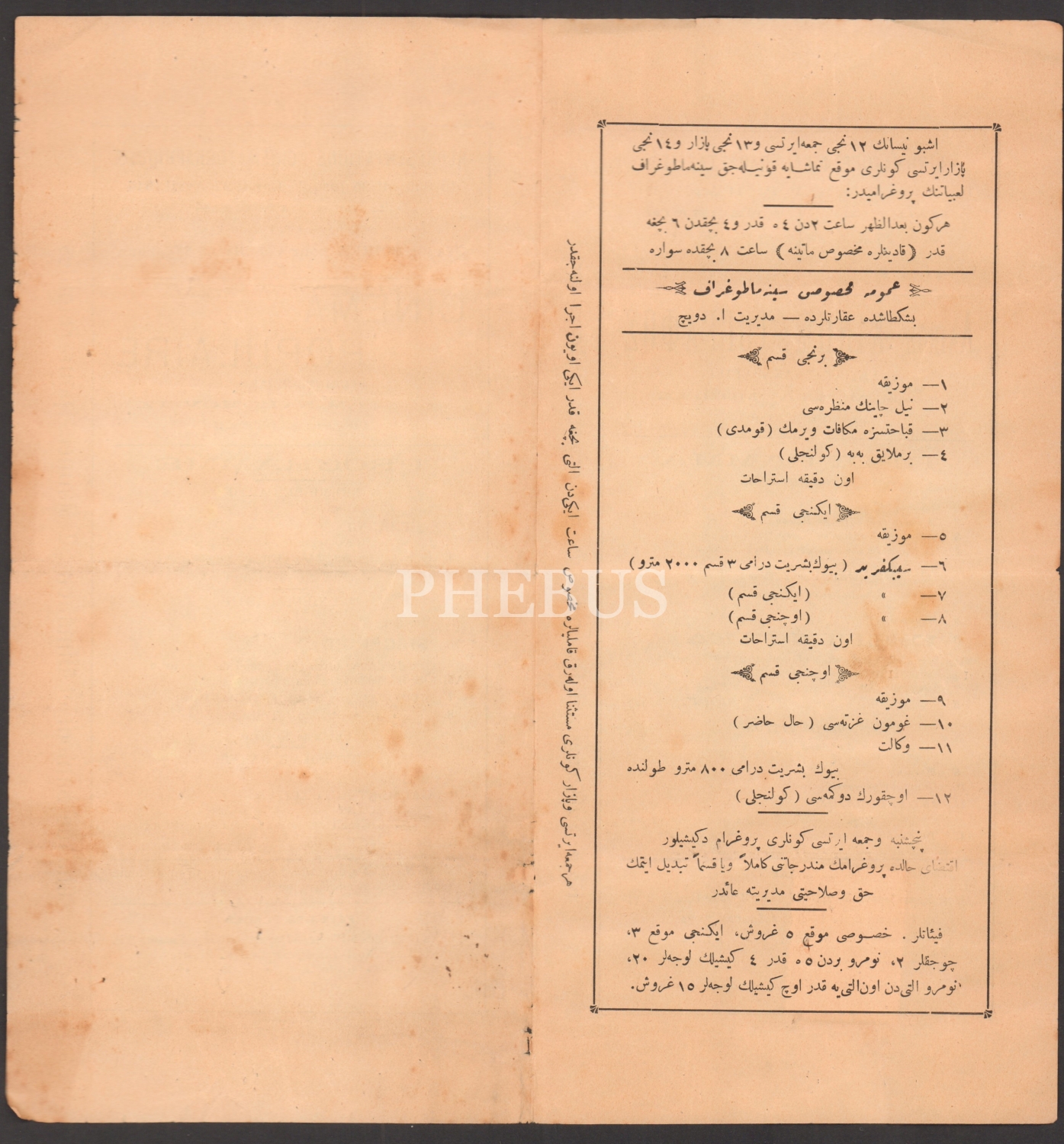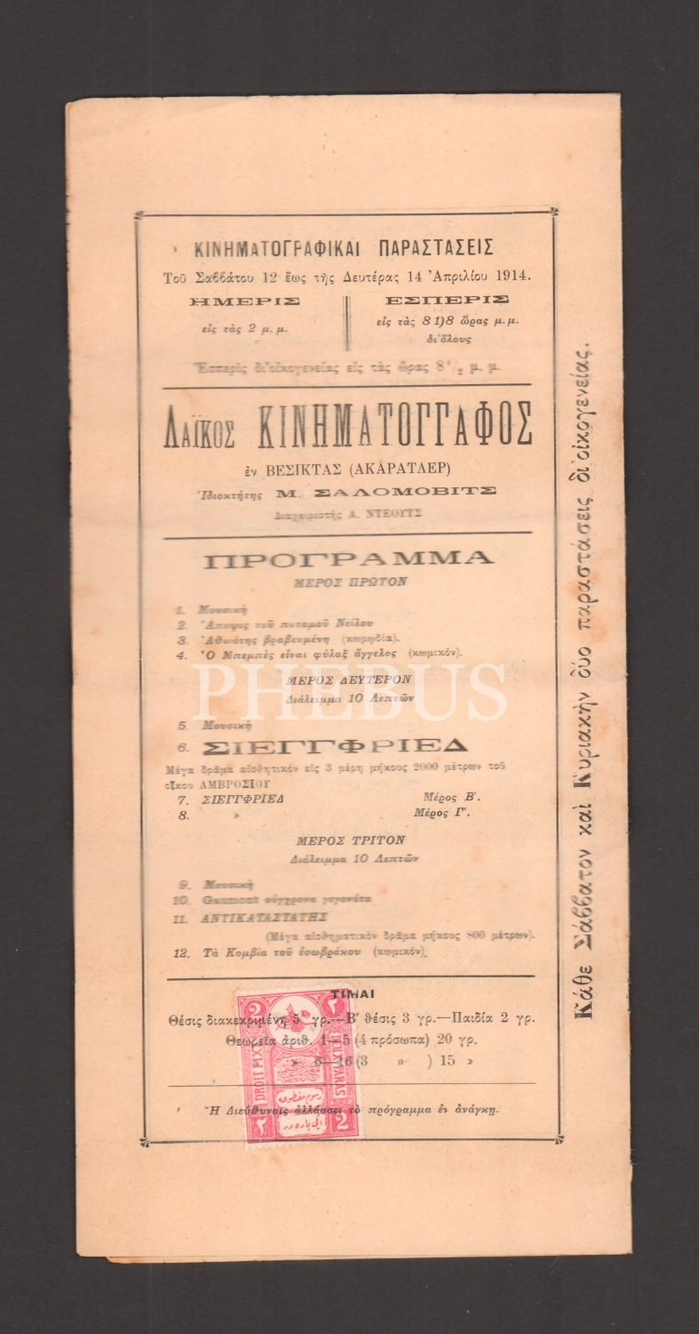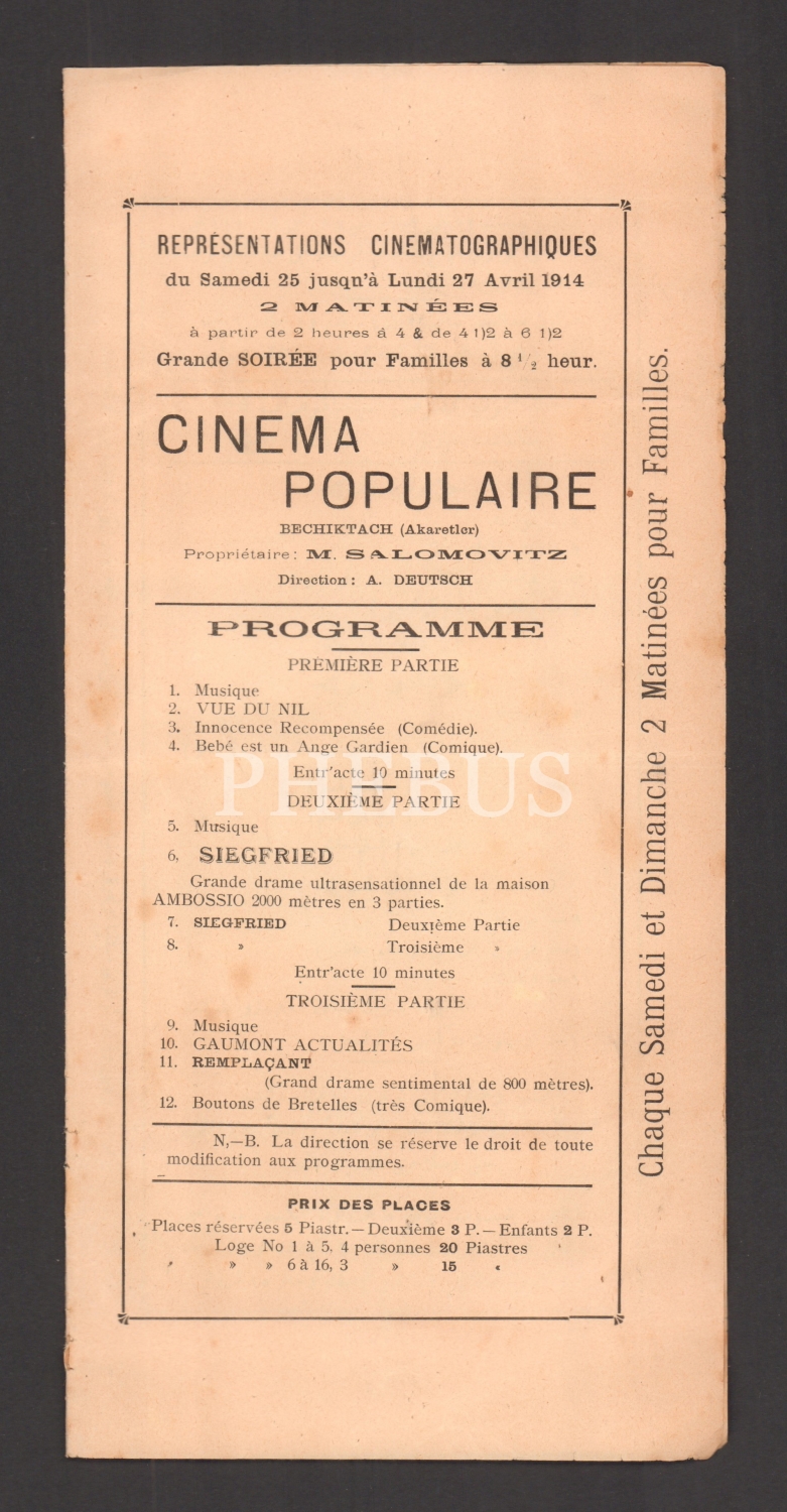 Beşiktaş Akaretler’de Sinema Popüler´de gösterime girecek oyunların tanıtıldığı Osmanlıca, Yunanca ve Fransızca el ilanı, 28x14 cm...