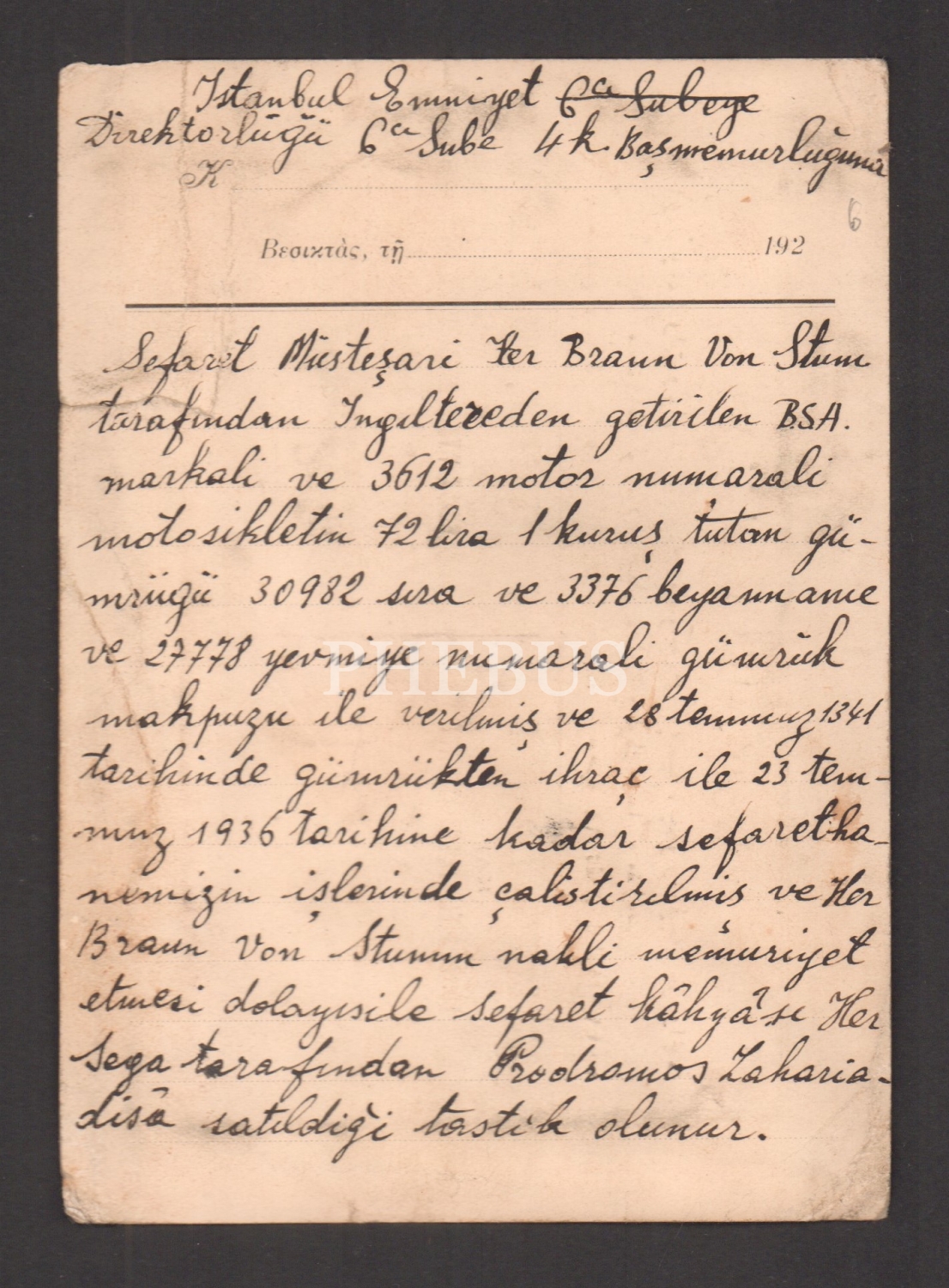 Arka yüzünde, İstanbul Emniyet Müdürlüğü’ne yazılmış, Prodromos Zahariadis’e devrolunan bir motosikletin ruhsatının devri ile ilgili yazı mevcut.