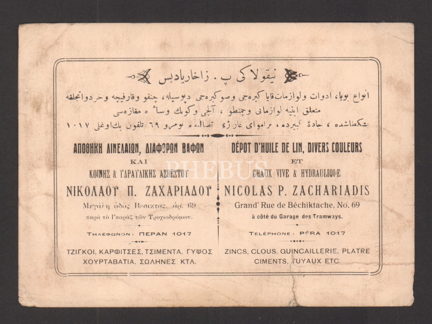 “NİKOLAKİ P. ZAHARYADİS – Envai boya, edevat ve levazımat ve kaya kireci ve su kireci su deposuyla, çinko ve karfiça ve hırdavatçılığa müteallik levazımat ve çimento, alçı ve köpük ve saire mağazası” antetli, Osmanlıca, Yunanca ve Fransızca olmak üzere 3 lisanda yazılı, işyeri tanıtım kartı, 14x10 cm...