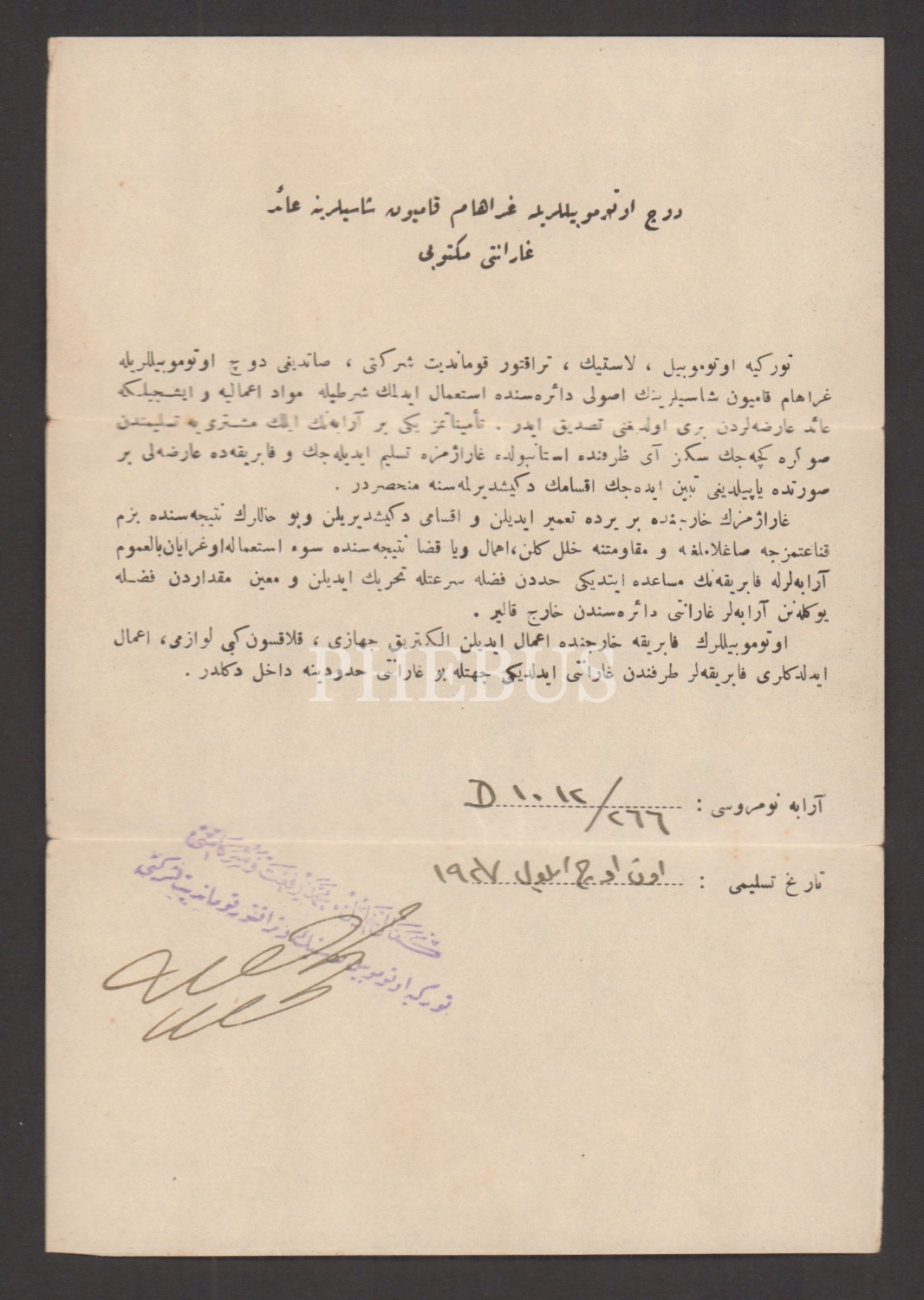 1927 yılına ait, “DOÇ Otomobilleriyle GRAHAM Kamyon Şasilerine Ait Garanti Mektubu” başlıklı, "Kemal Halil, Mehmed Refet ve Şürekası, Türkiye Otomobil ve Traktör Komandit Şirketi" ´nin kaşesini taşıyan garanti belgesi...