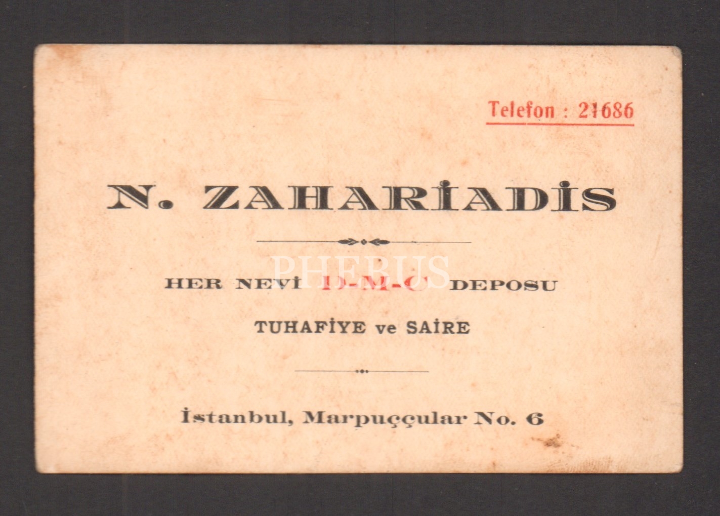 Zaharyades’e ait, “N. ZACHARİADİS – Her nevi D-M-C deposu – Tuhafiye ve Saire – İstanbul, Marpuççular No. 6 – Telefon: 21686” yazılı kartvizit...