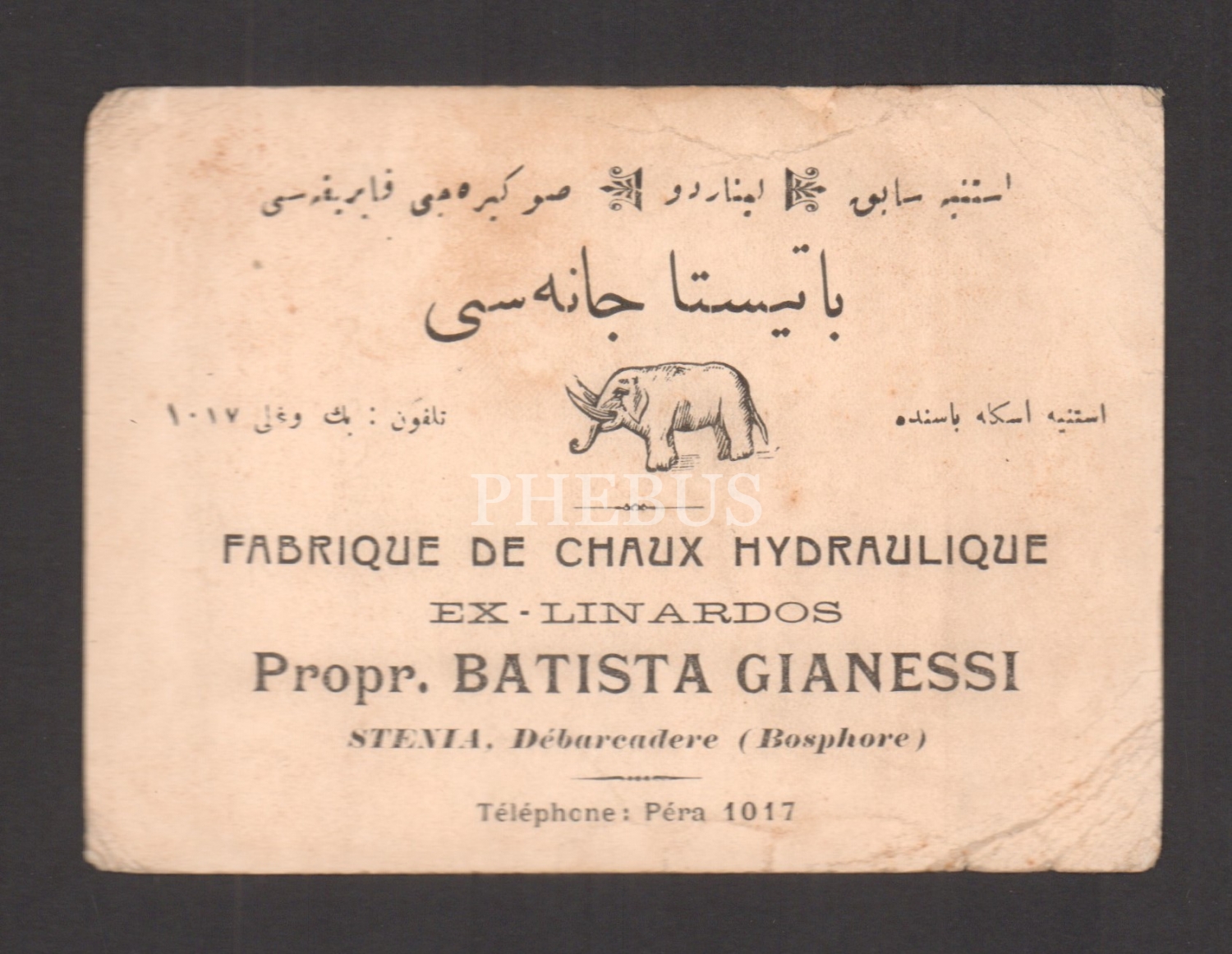 Fil desenli, “İstinye’de sabık Linardo su kireci fabrikası – Batista Canesi – Telefon: Pera 1017” Osmanlıca ve Fransızca çift dilde kartvizit, 12x9 cm...