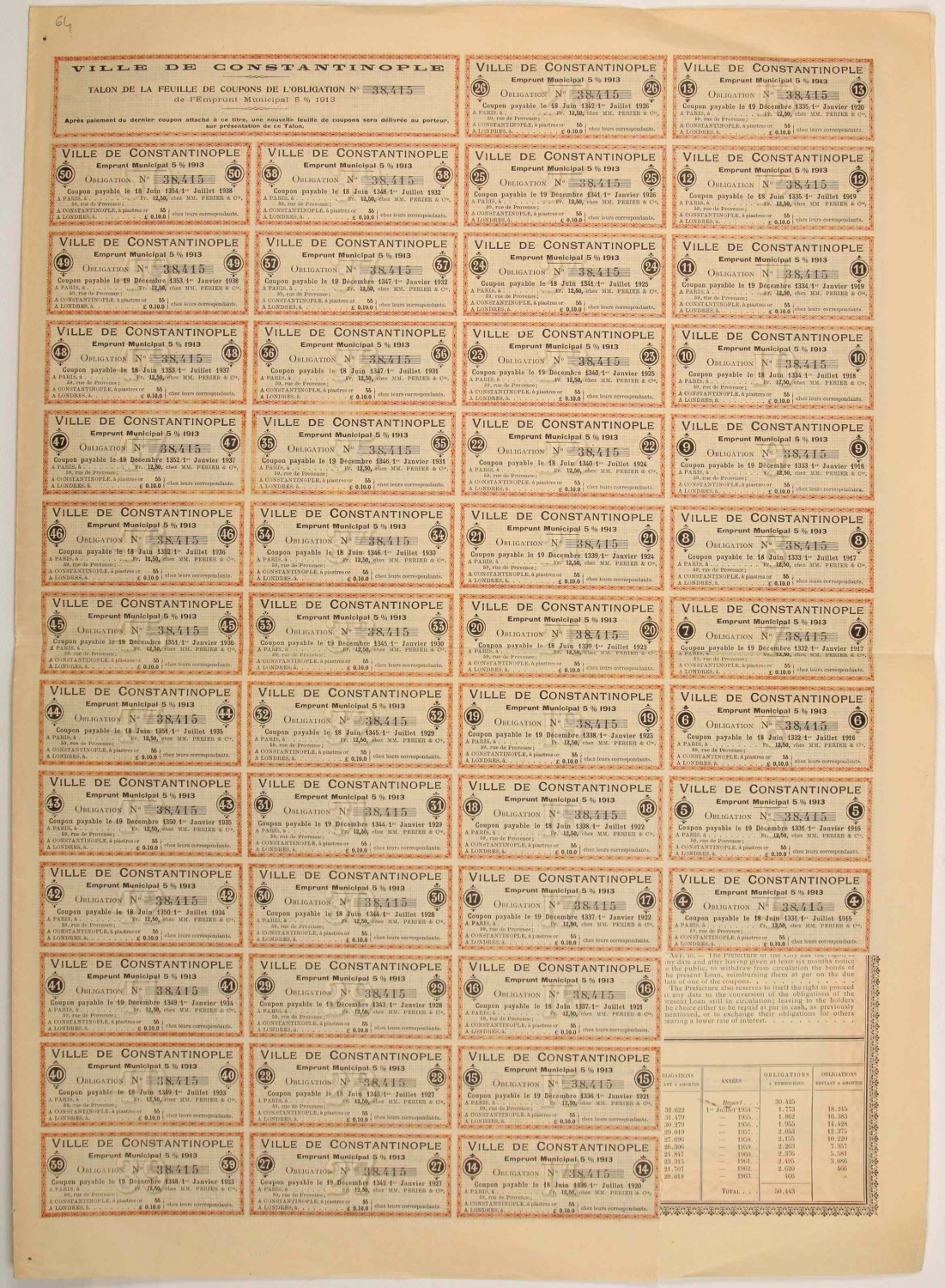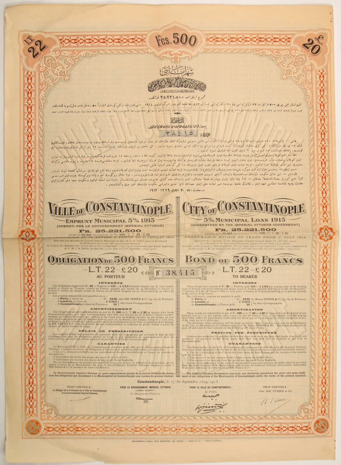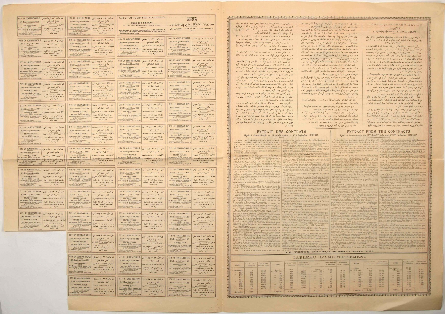 Osmanlıca, İngilizce, Fransızca Şehremaneti hisse senedi, 4 sayfa, 35x50 cm