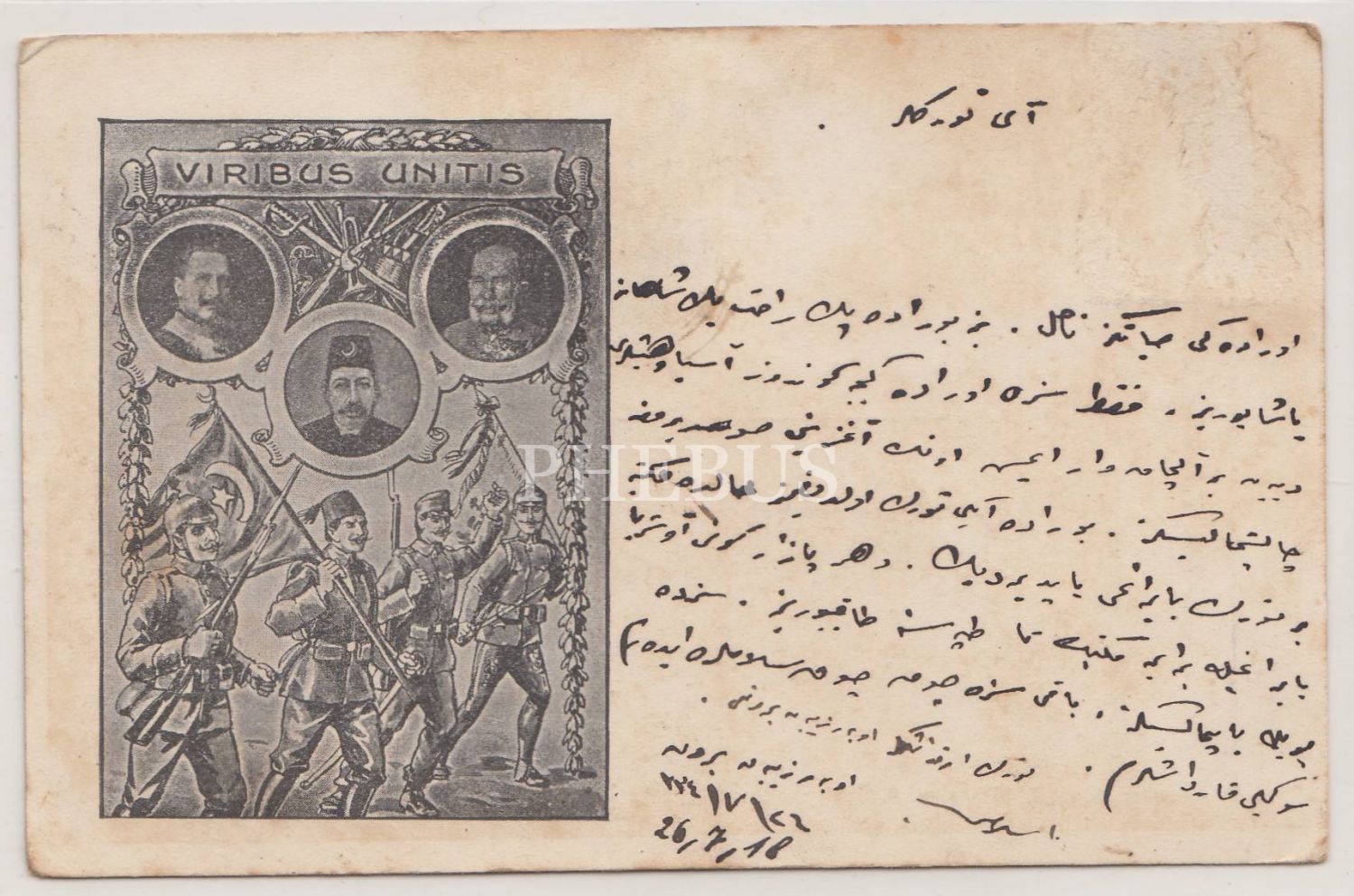 II. Wilhelm, I. Franz Joseph, V. Mehmed Reşad ve askerler görselli ve üzerinde Avusturya´da eğitim gören Türk askerlerinin mektubu yer alan İttifak kartpostalı...