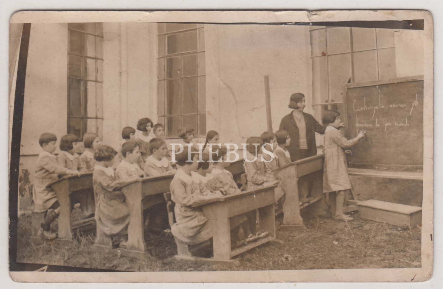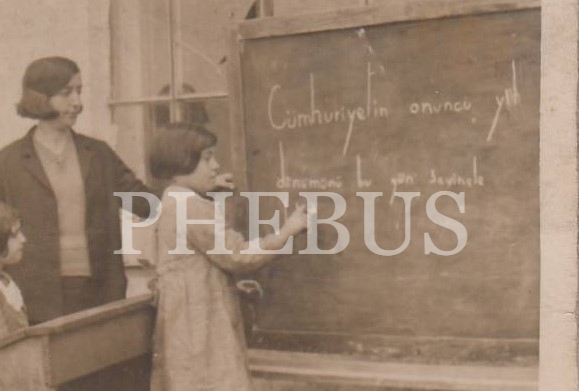 "Cumhuriyet´in 10´uncu Yıldönümünü bugün sevinçle kutluyoruz" yazan öğrenci, öğretmeni ve sınıf arkadaşlarını gösteren fotoğraf...