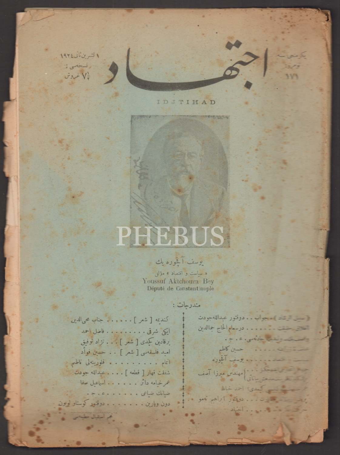 "Siyaset ve İktisad Müellifi" alt başllığıyla Yusuf Akçura Bey´in fotoğrafını kapağına taşıyan İCTİHAD dergisinin 1 Teşrinisani 1924 tarihli nüshası...