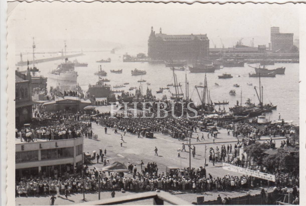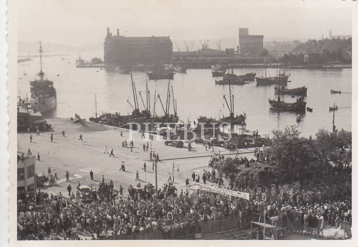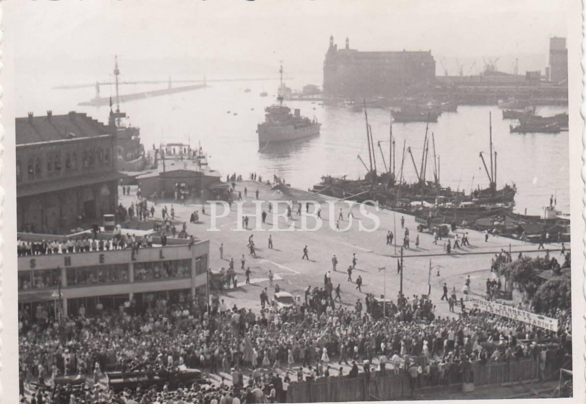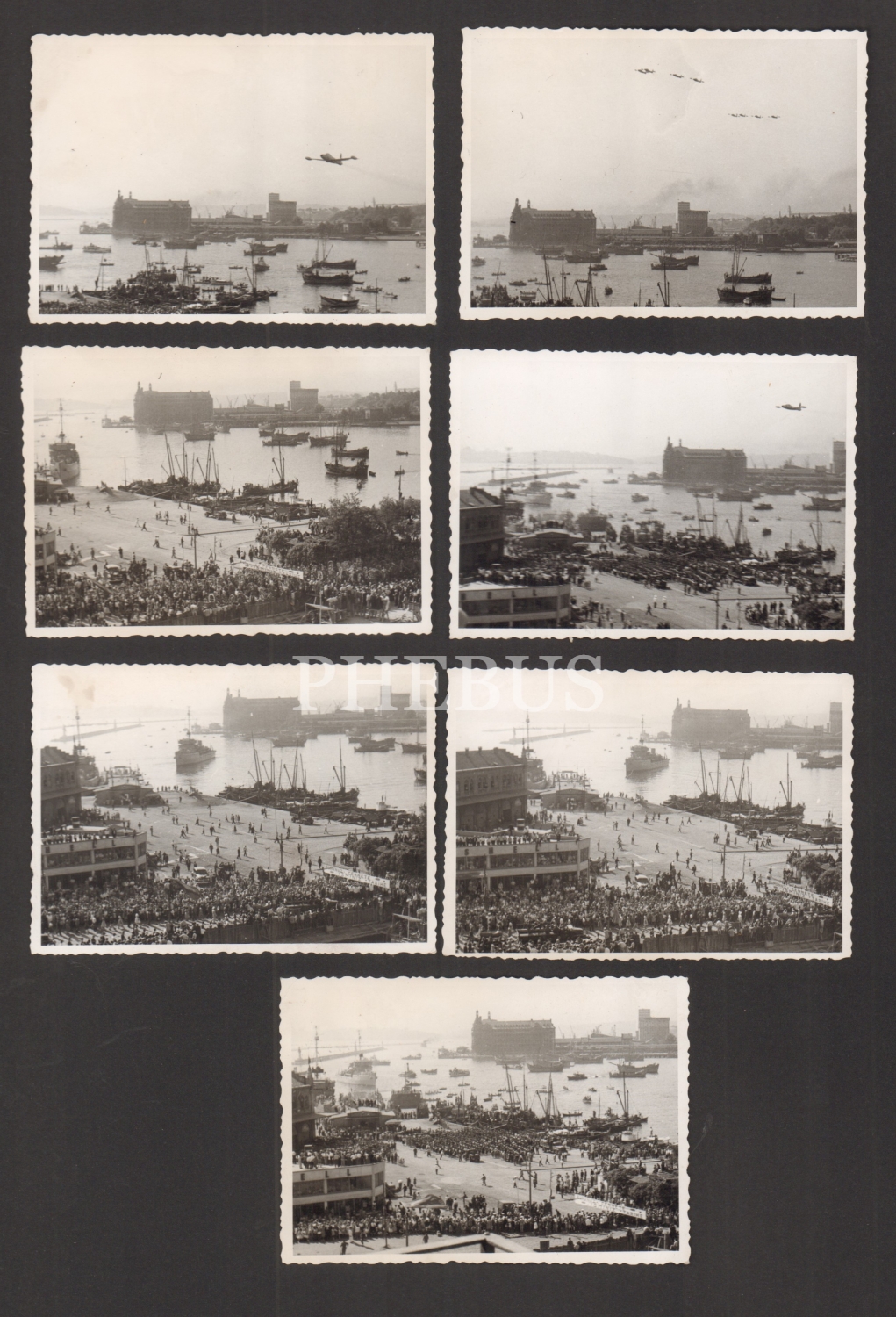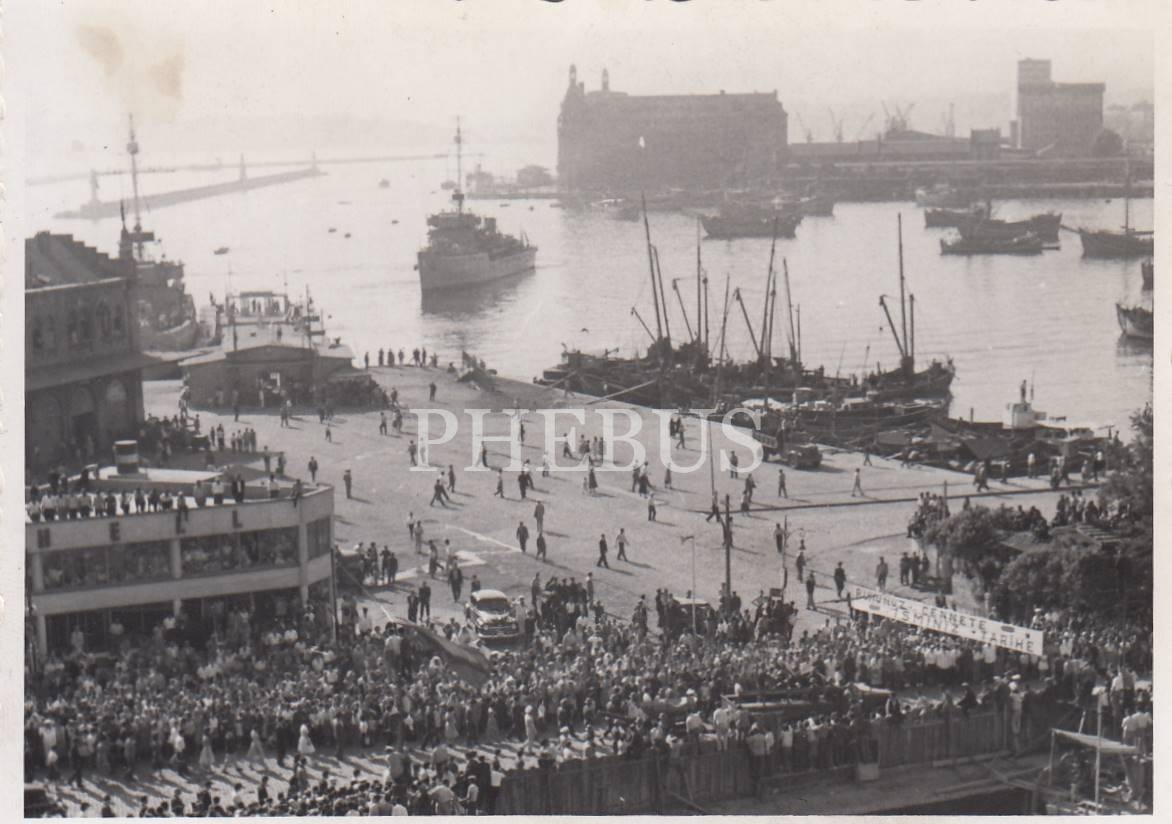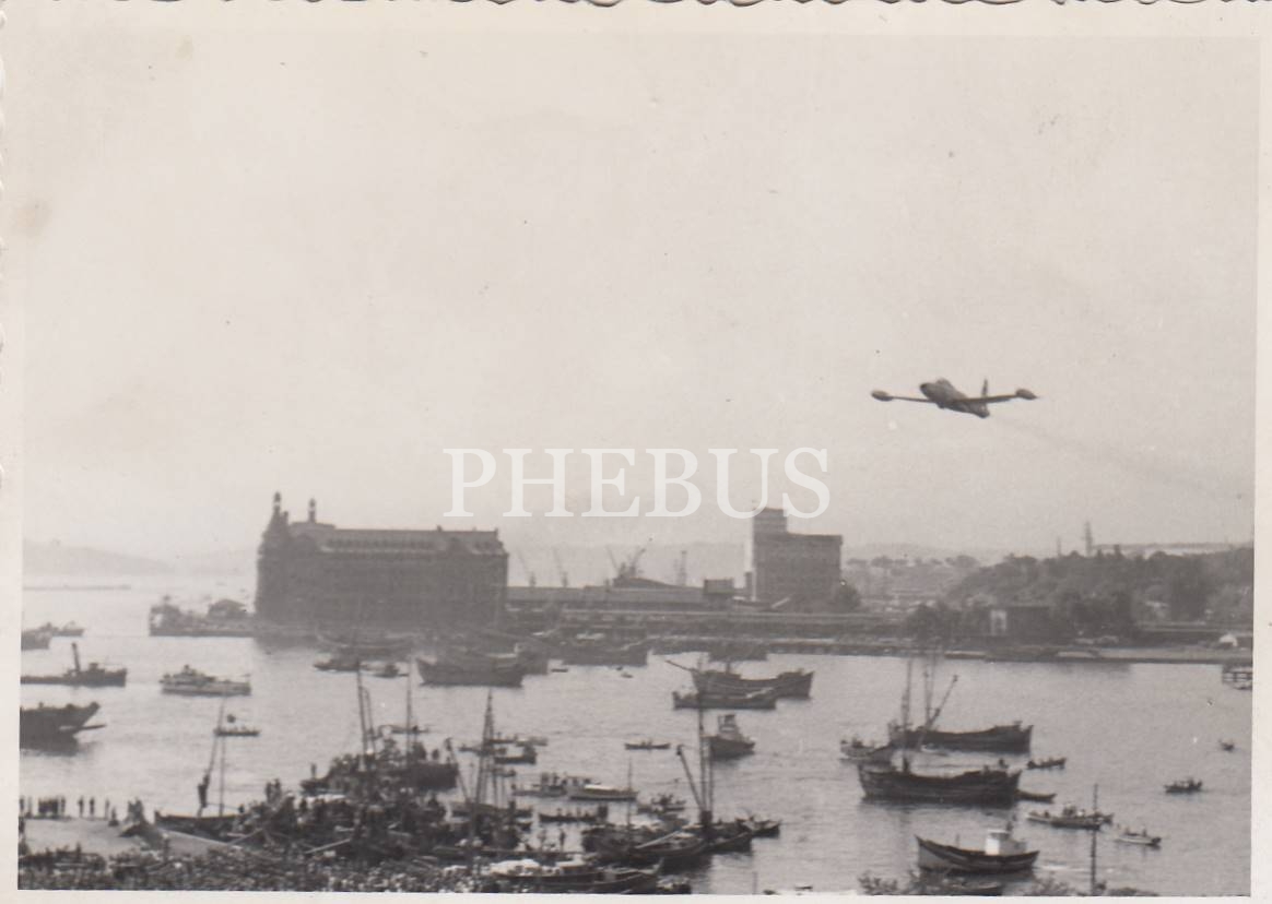 Bugünkü Kadıköy İskelesi önünüde, ellerinde "Ruhunuz cennete, İsminiz tarihe" yazılı pankart taşıyan insanlar, göyüzünde jet uçakları ve arka planda Haydarpaşa manzaralı, Cumhuriyet Bayramı kutlamalarına ait 7 adet fotoğraf...