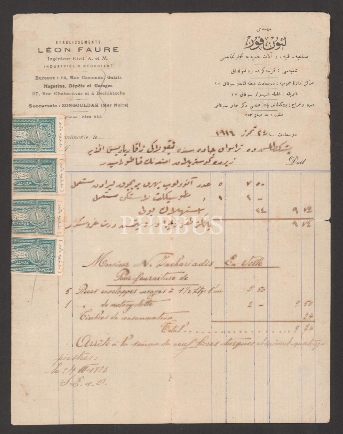 24 Temmuz 1916 tarihli, Zonguldaklı İnşaat Mühendisi "Leon For / Leon Feure" antetli, Fransızca ve Osmanlıca olmak üzere 2 dilde fatura...
