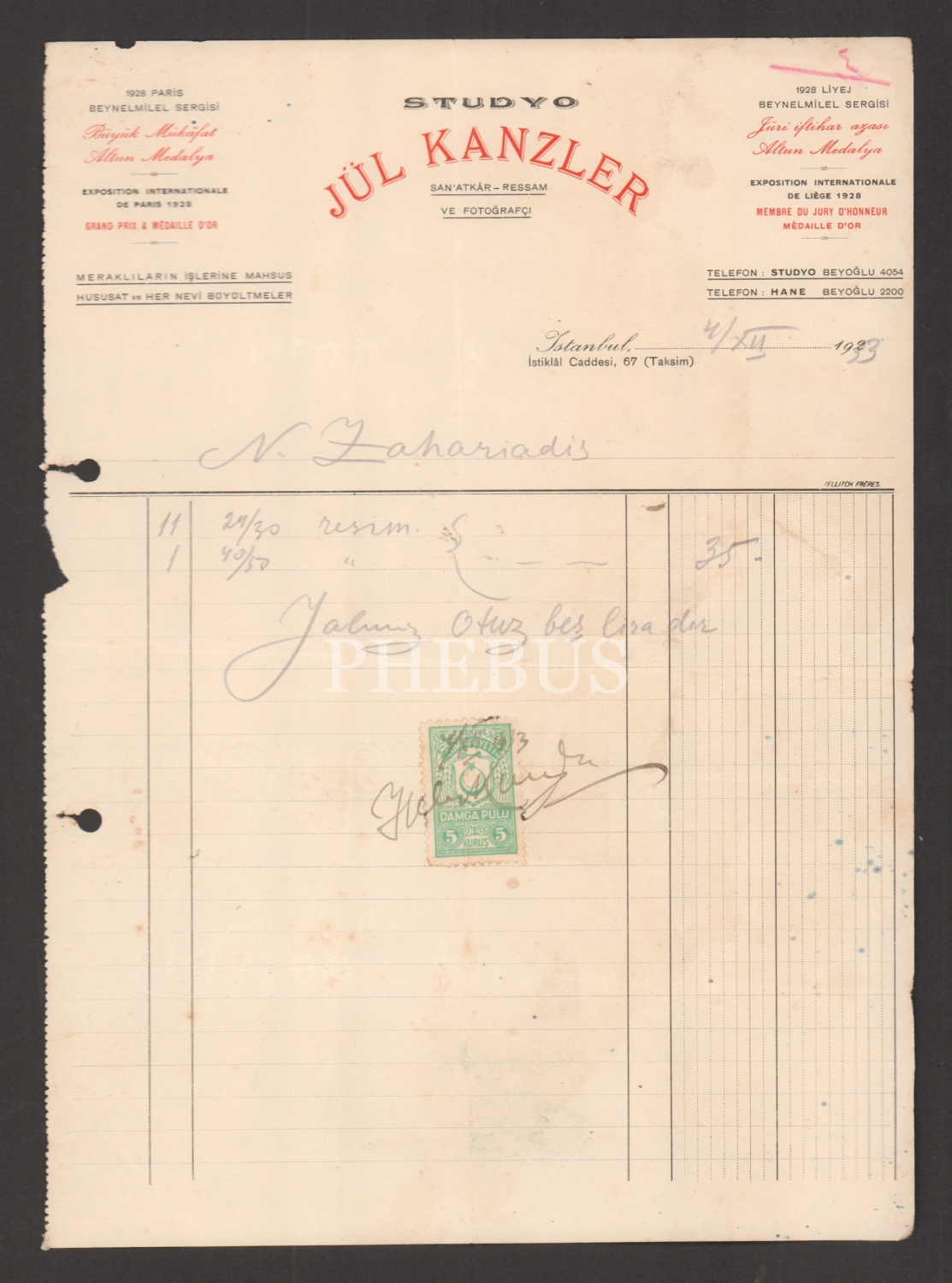4 Aralık 1933 tarihli, "Sanatkar-Ressam ve Fotoğrafçı Jül Kanzler´in Stüdyosu" antetli, N. Zahariadis´e yazılmış 35 Liralık fatura...