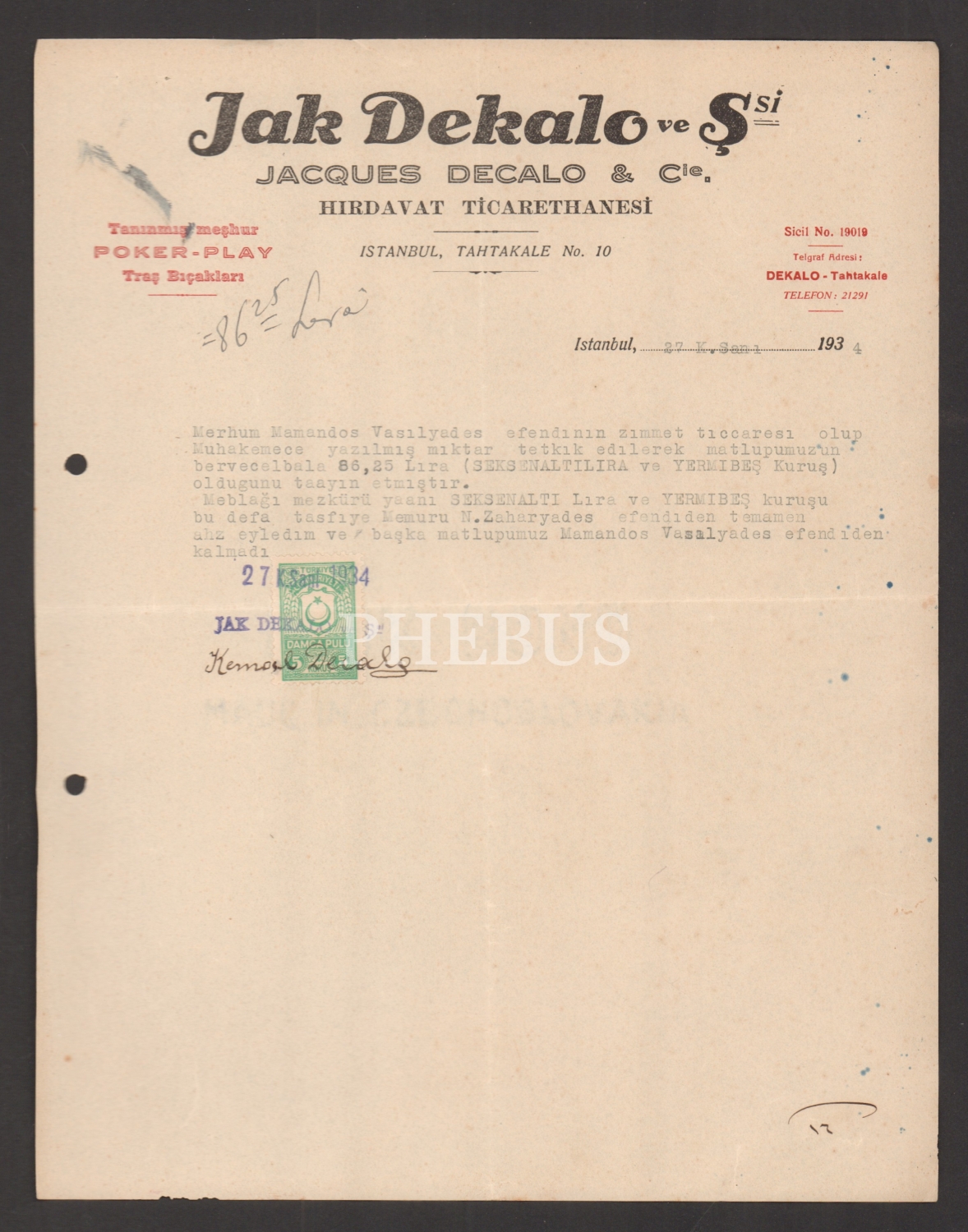 27 Ocak 1934 tarihli, "Jak Dekalo ve Şürekası - Poker Play Traş Bıçakları - Hırdavat Ticarethanesi" antetli, 86,25 Liranın N. Zahariyades´den nakden tahsil edildiğine dair belge...