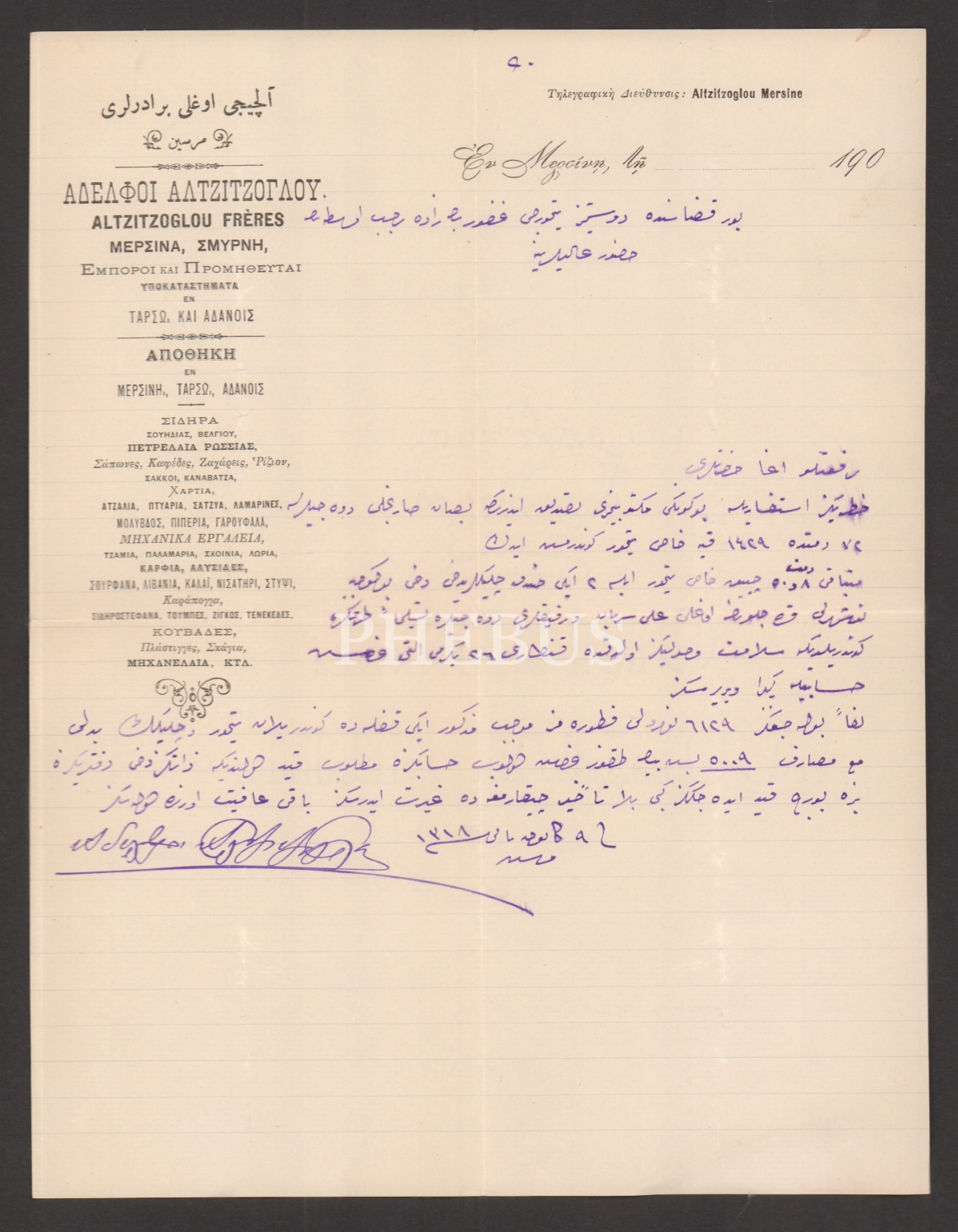 "Alçıcızade Biraderler - Mersin / İzmir" (Osmanlıca, Rumca ve Fransızca) antetli kağıt üzerine Bor kazasından Receb Bey´e yazılmış Osmanlıca mektup, 9 Ocak 1318 (1902)...