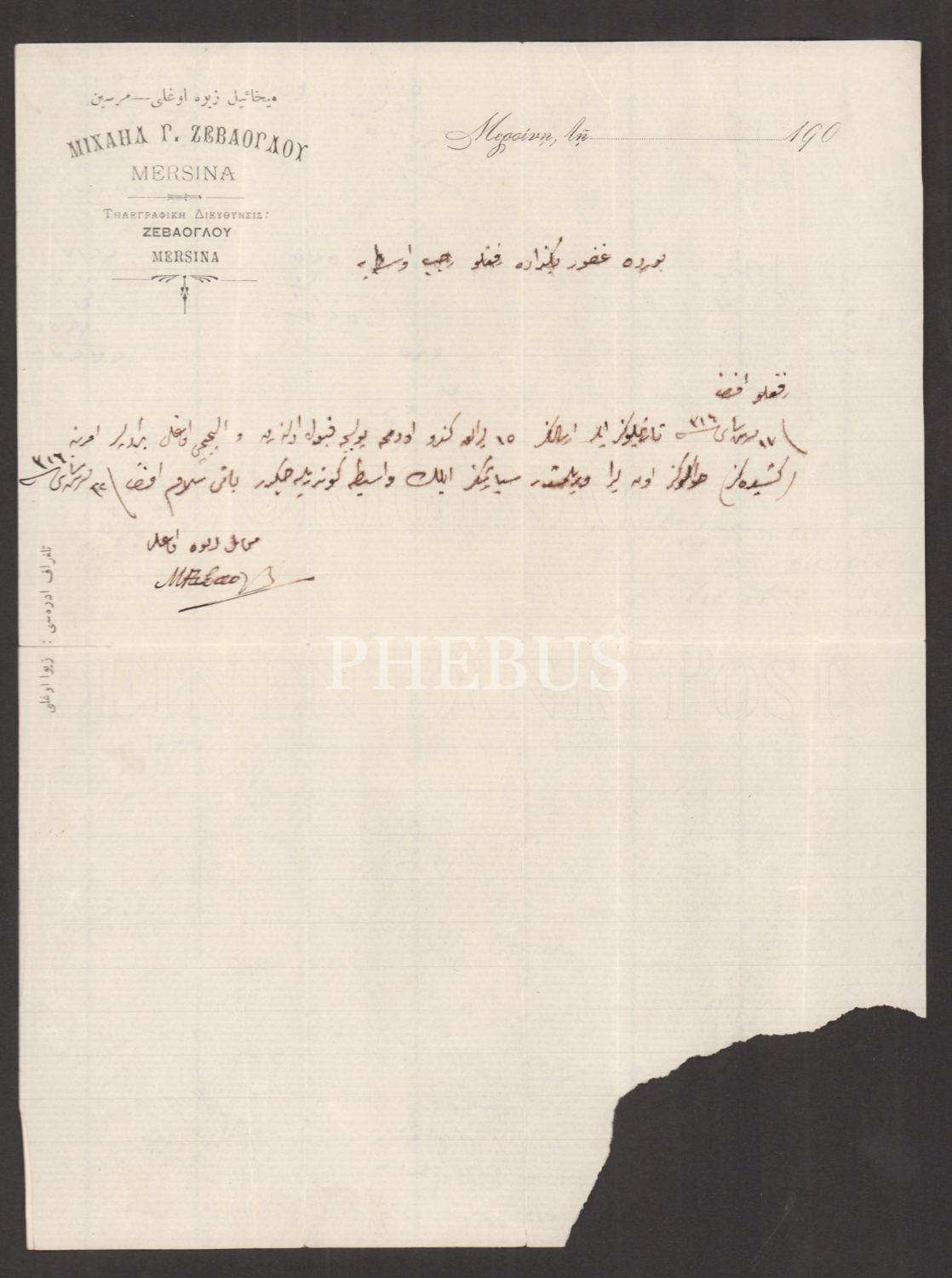 "Mihail Zivaoğlu - Mersin" (Osmanlıca, Rumca ve Fransızca) antetli, Bor kazasında Receb Bey´e yazılmış Osmanlıca mektup, 17 Kasım 1314 (1898)...