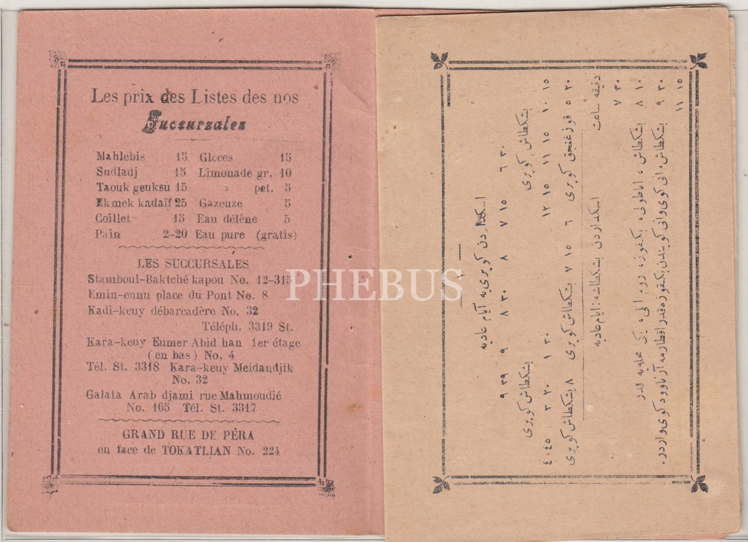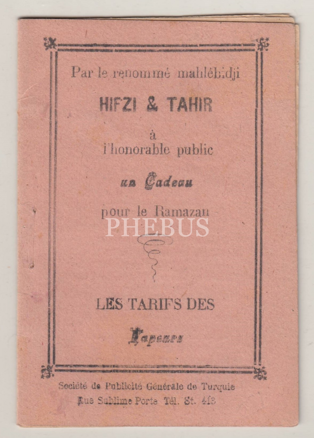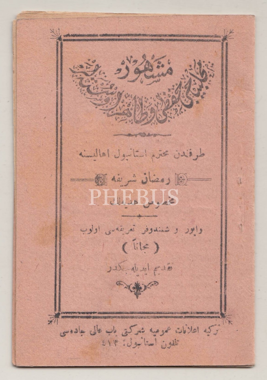 "Meşhur Muhallebici Hıfzı ve Tahir Ustalar tarafından muhterem İstanbul ahalisine Ramazan-ı Şerif´e mahsus hediyelik vapur ve şimendifer tarifesi olup meccanen takdim edilecektir" yazılı, Muhallebici Hıfzı ve Tahir Ustalar´ın sattıkları ürünlerinin fiyatları ile vapurların hareket saatlerinin yazılı olduğu tarife...