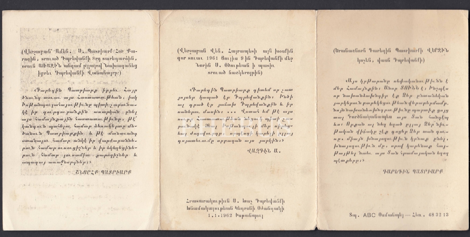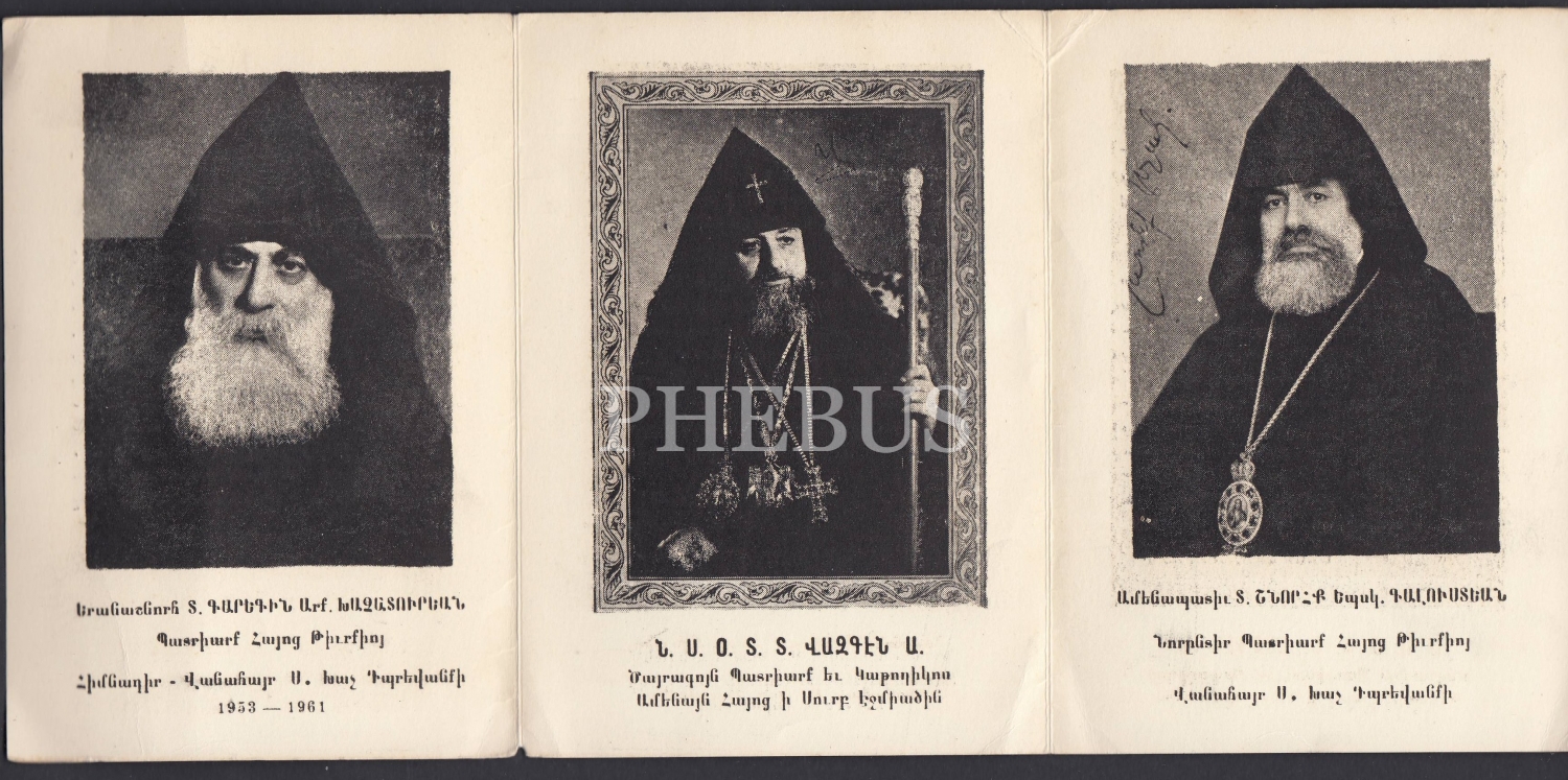 İstanbul Ermeni Patriği Karekin 1. Haçaduryan, Ermeni Ortodoks ve Gregoryen Kiliseleri lideri Vazken ve Türkiye´nin 82´nci Patriği Şınorhk Kalustyan fotoğraflı ermenice katlanır broşür...