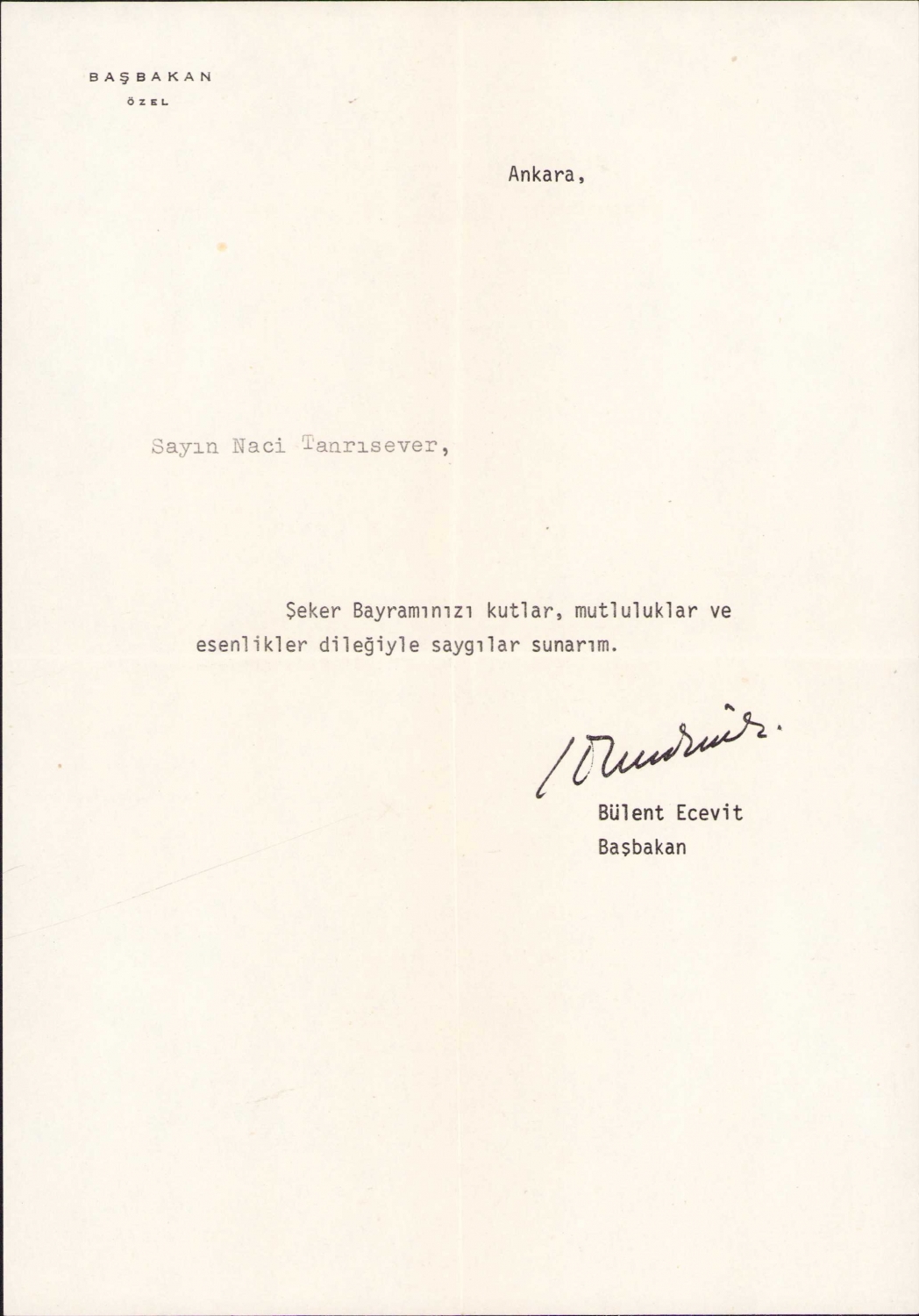 Başbakan Özel antetli Bülent Ecevit'den Naci Tanrısever'e bayram tebriği, 16x24 cm