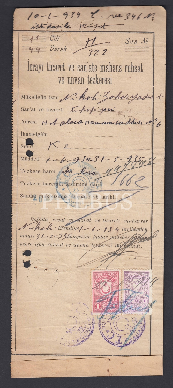 1 Haziran 1934 tarihli, Prodromes Zahariadis´e ait "İcra-yı ticaret ve sanata mahsus ruhsat ve unvan tezkiresi."