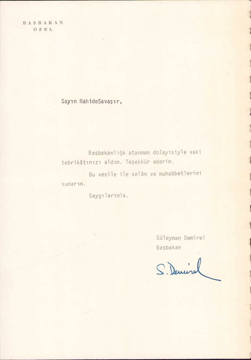 Başbakan Özel antetli Başbakan Süleyman Demirel'den Nahide Savaşır'a yazılmış evrak, 16x25 cm