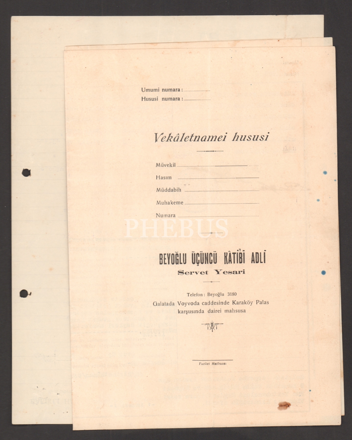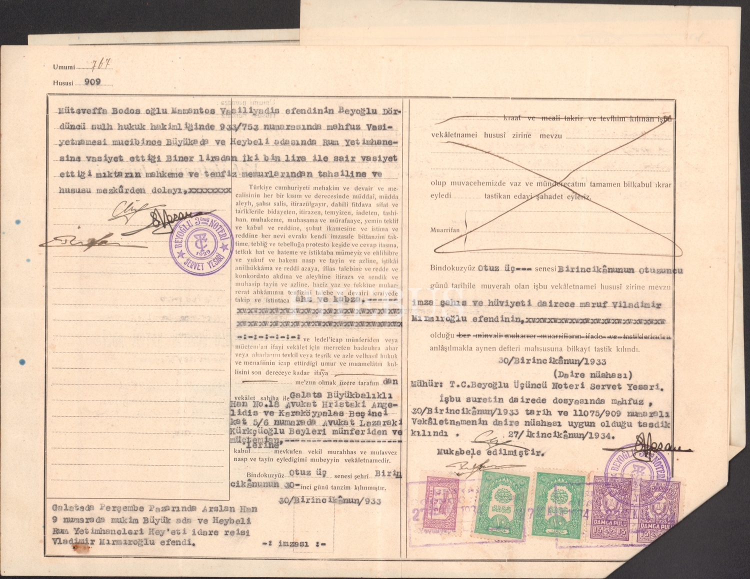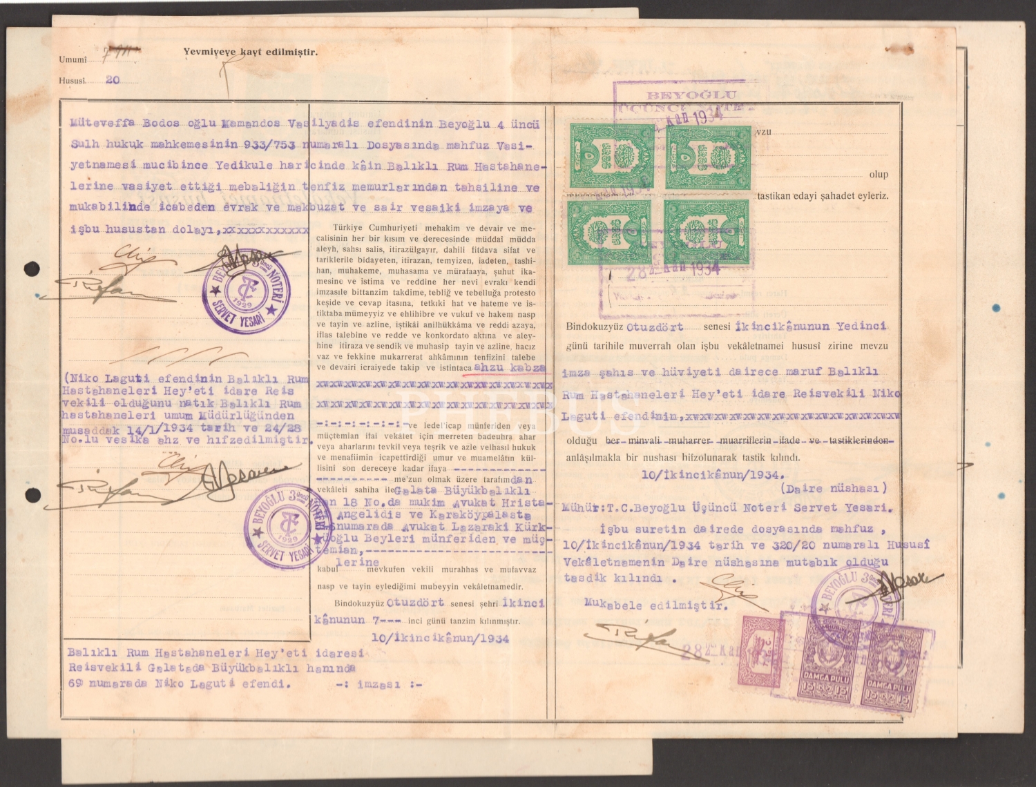 28 Ocak 1934 tarihli, Balıklı Hastaneleri Genel Müdürlüğü antetli, Vasiliadis Efendi´nin Balıklı Rum Hastanesi, Heybeliada Rum Yetimhanesi ve Büyükada Rum Yetimhanesi hisselerine ait 4750 liranın Nikola Zahariadis´den alındığına dair ve Beyoğlu Üçüncü Noteri Servet Yesari´den alınmış belgeler...