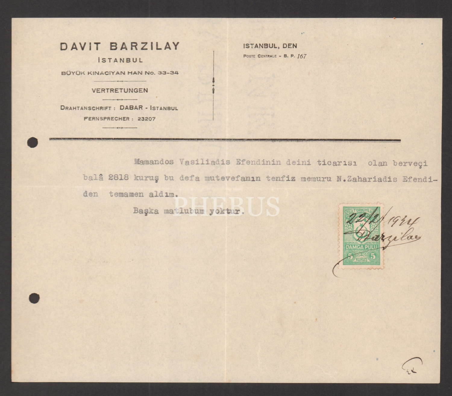22 Şubat 1934 tarihli, Davit Barzılay antetli, Vasiliadis Efendi´nin borcu olan ait 2818 kuruşun Nikola Zahariadis´den alındığına dair belge...