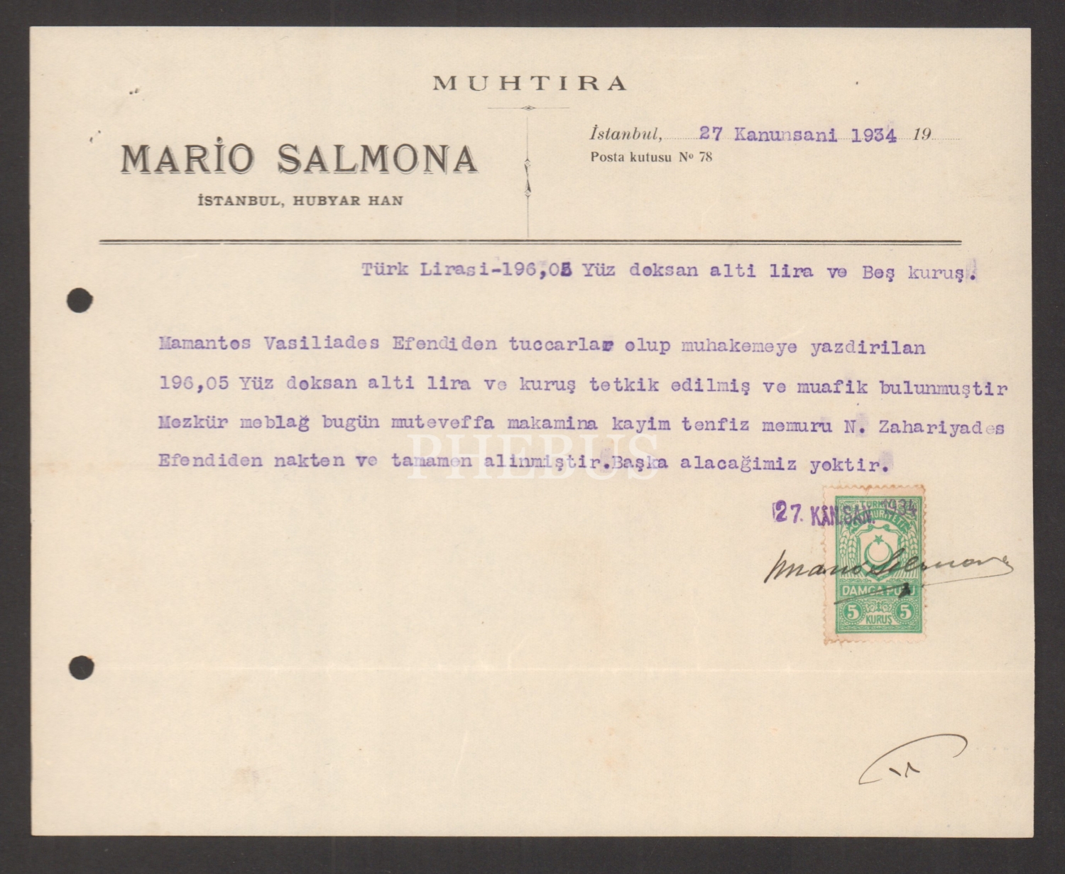 27 Ocak 1934 tarihli, Mario Salmona antetli, Vasiliadis Efendi´nin borcu olan ait 196 lira 5 kuruşun Nikola Zahariadis´den alındığına dair belge...