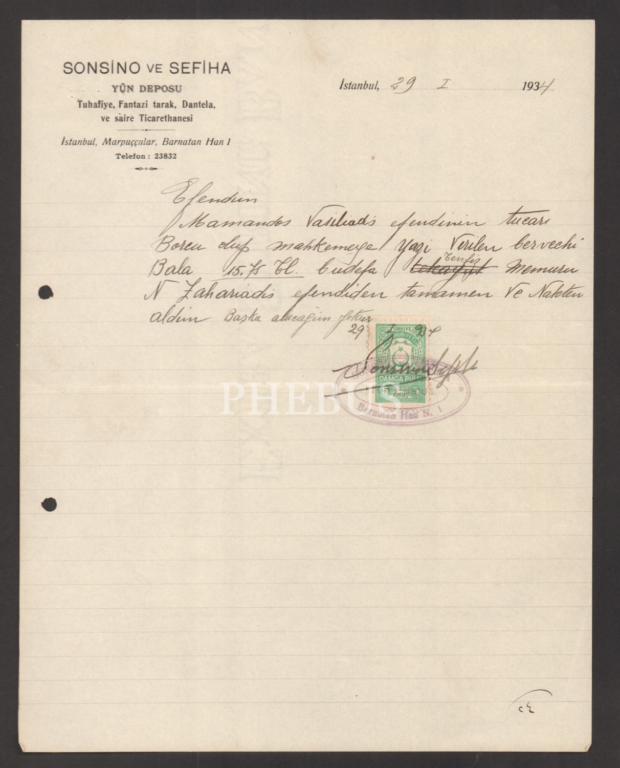 29 Ocak 1934 tarihli, "Sonsino ve Sefiha - Yün Deposu, Tuhafiye, Fantazi Tarak, Dantela vs. Ticarethanesi" antetli, Vasiliadis Efendi´nin borcu olan ait 15 lira 75 kuruşun Nikola Zahariadis´den alındığına dair belge...