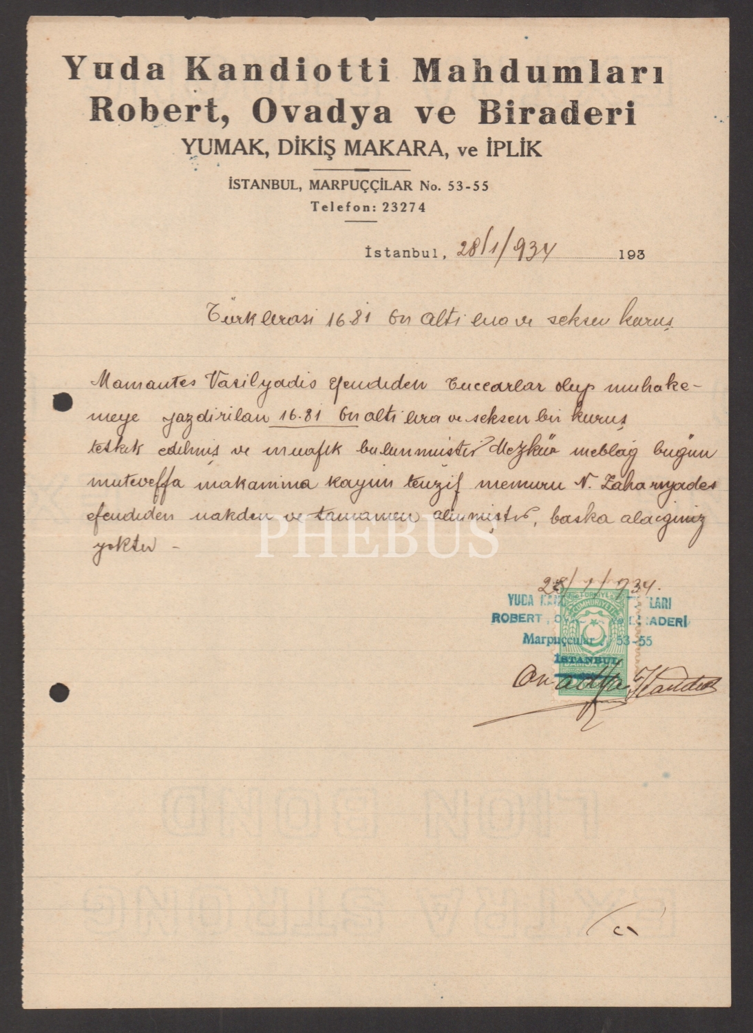 28 Ocak 1934 tarihli, "Yuda Kandiotti Mahdumları - Yumak, Dikiş, Makara ve İplik" antetli, Vasiliadis Efendi´nin borcu olan ait 16 lira 81 kuruşun Nikola Zahariadis´den alındığına dair belge...