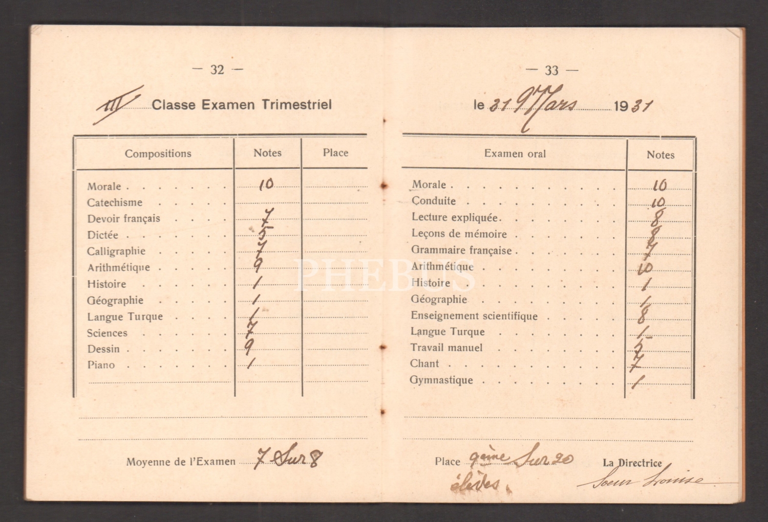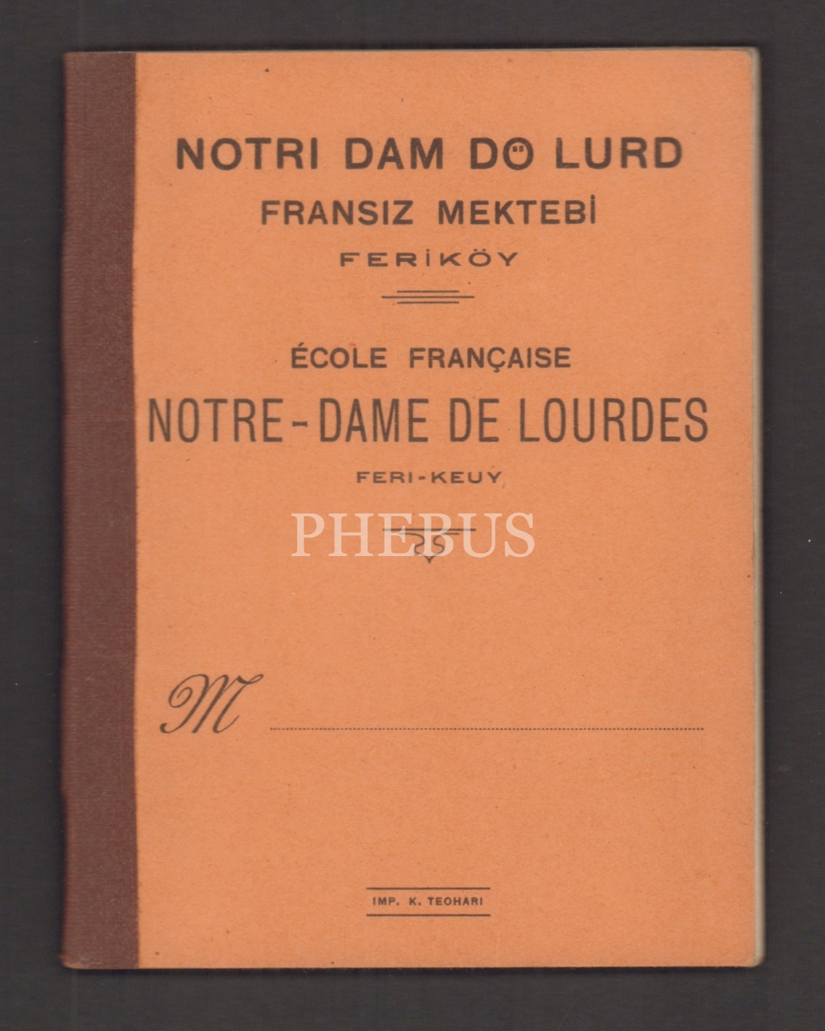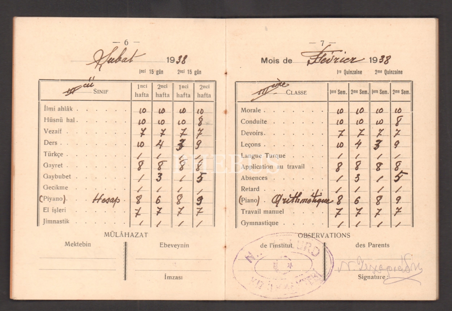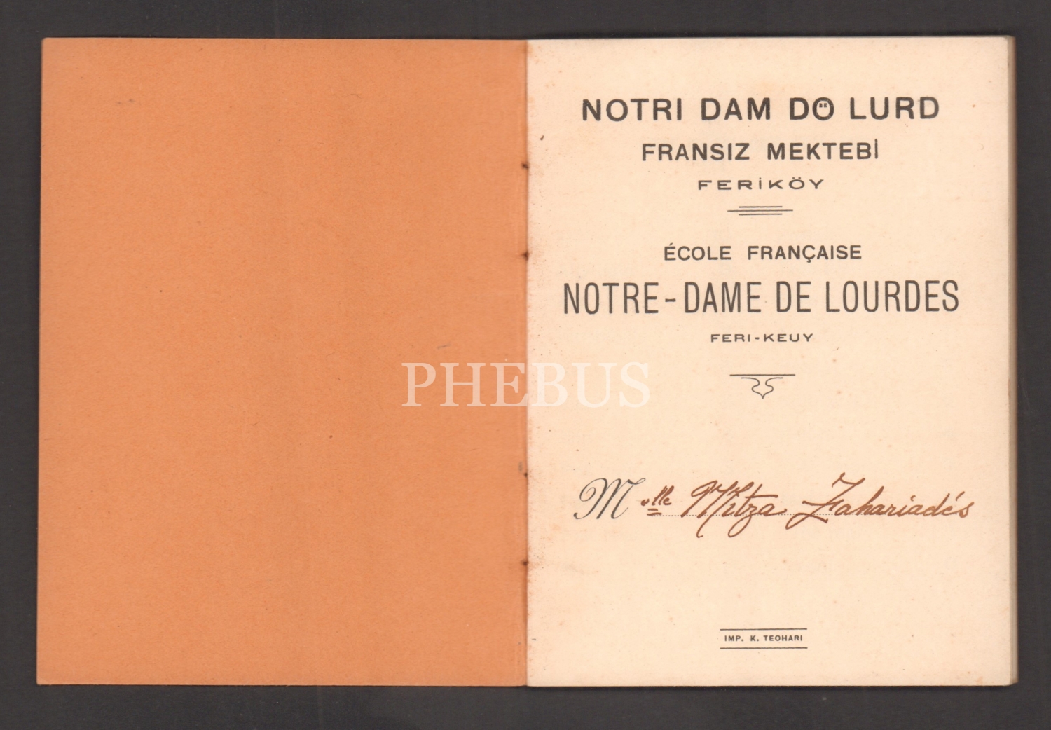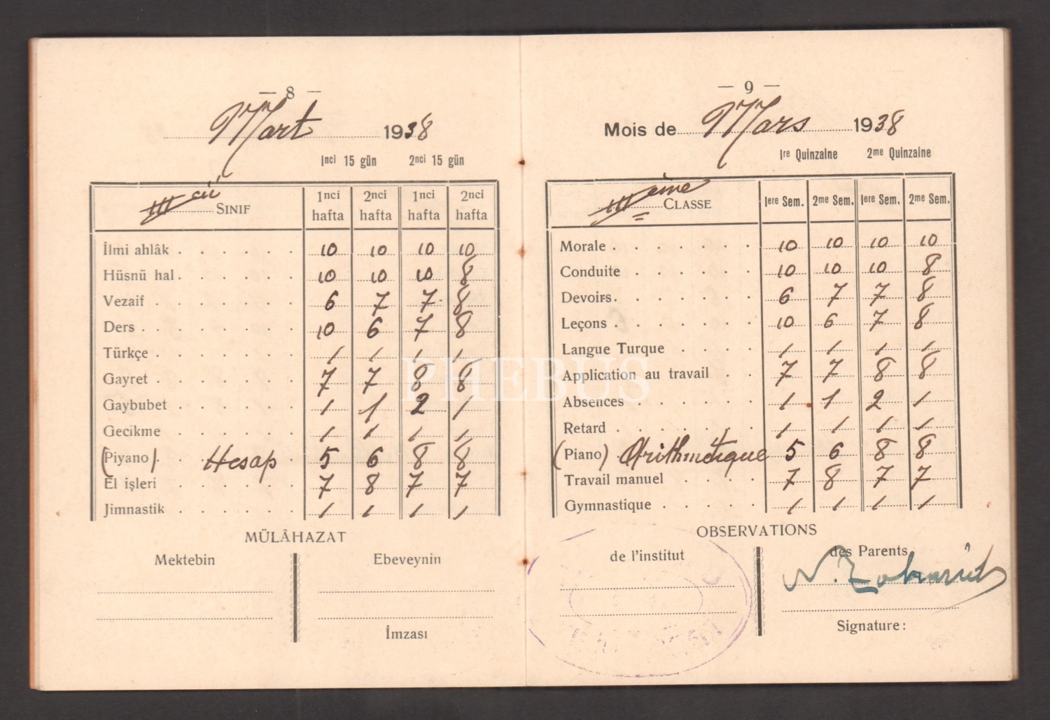 Mitza Zahariadis´e ait 1938 eğitim yılı "Notri Dam Dö Lurd Fransız Mektebi (Feriköy)" karnesi...