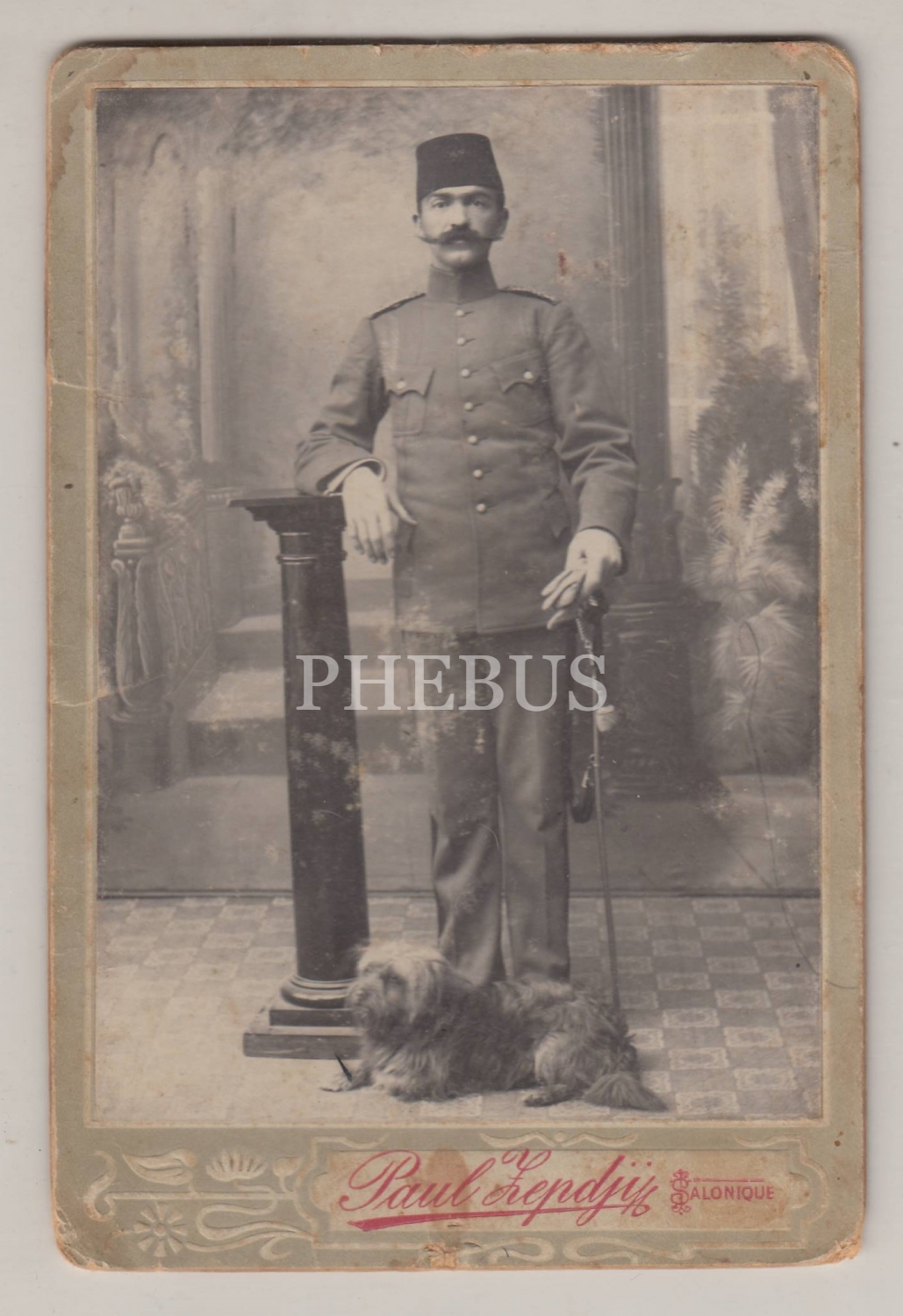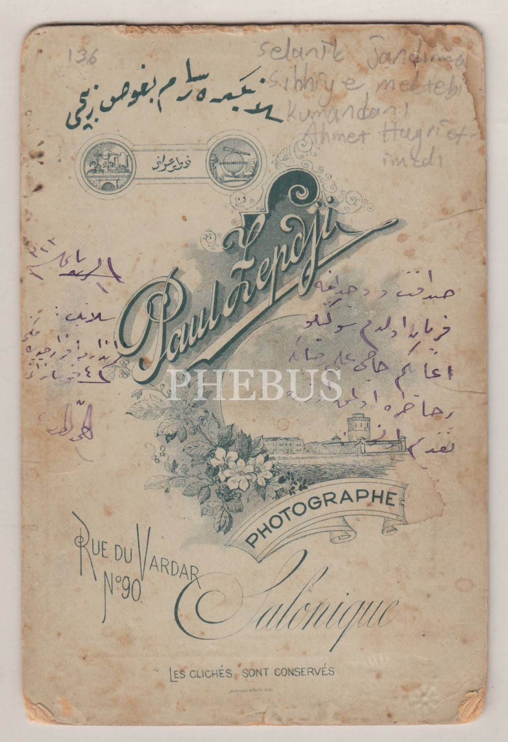Osmanlı dönemi, Selanik Jandarma Sıhhiye Mektebi Kumandanı Ahmet Hayri Efendi´nin kardeşi Hacı Ali Rıza Bey´e ithaf edip imzaladığı kabin fotoğrafı, Paul Zepdji Fotoğrafhanesi, 16x11 cm...