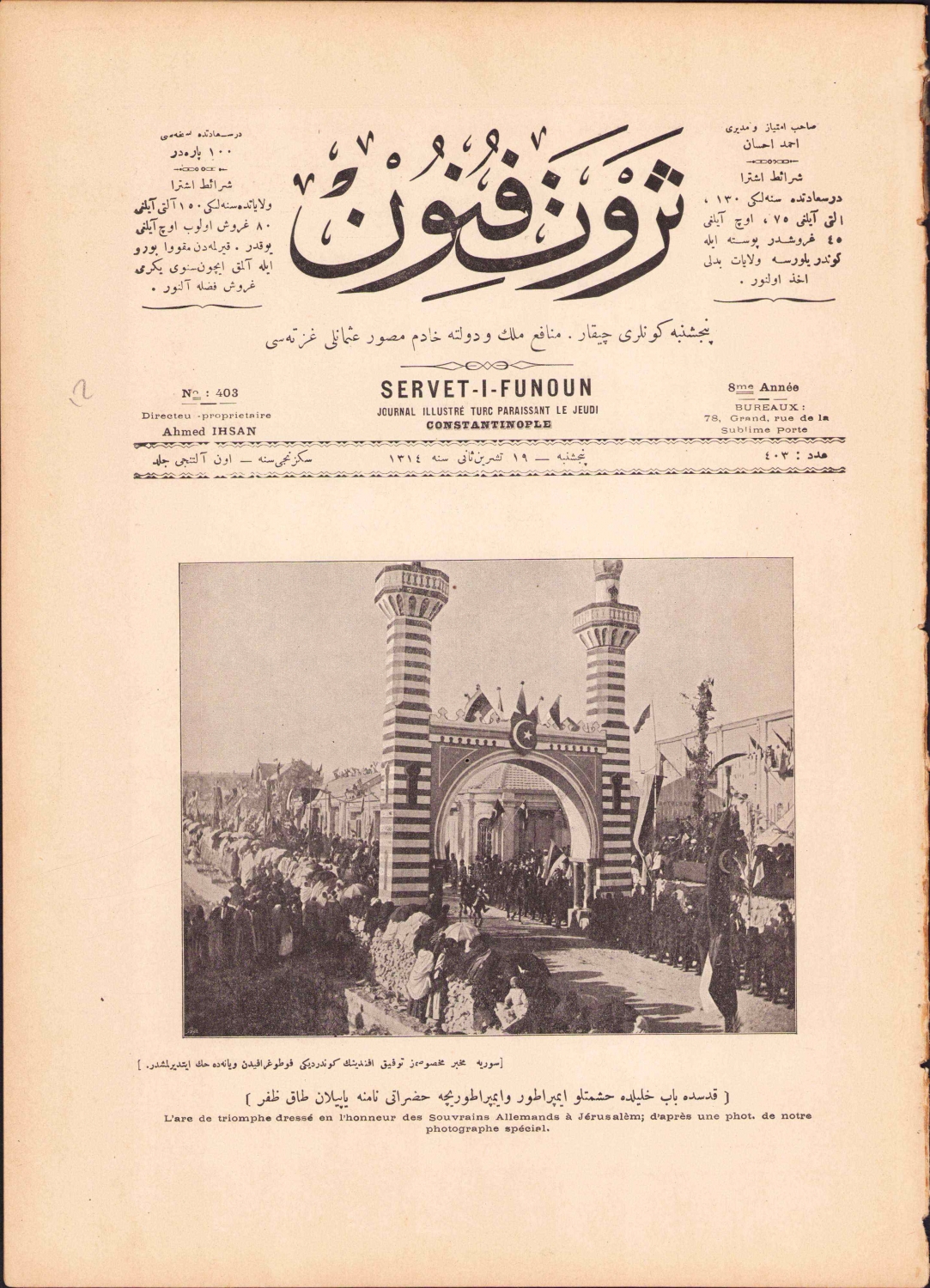 Osmanlıca Serveti Fünun gazetesi 1314, kapak "Kudüsde bab-ı halilde haşmetli imparator ve imparatoriçe hazreti namına yapılan tak-ı zafer", resimli, 16 sayfa, 24x34 cm