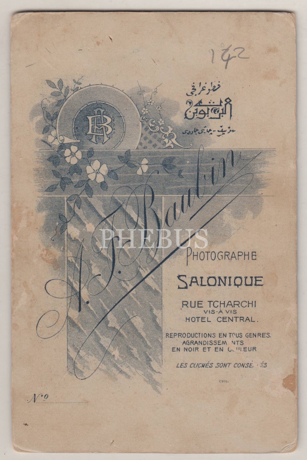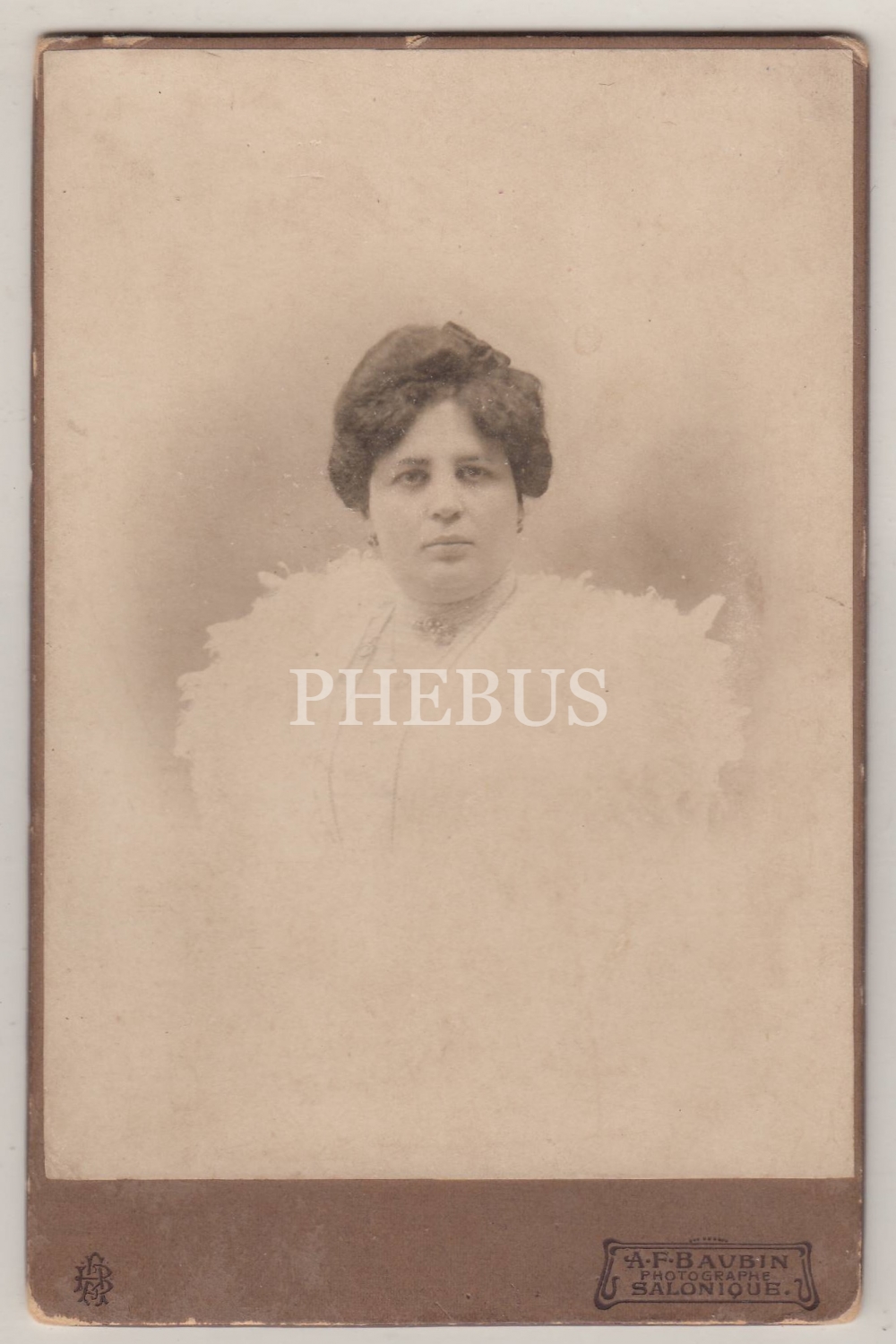 Şık giyimli bir hanımefendinin kabin fotoğrafı, Selanik merkezli Bobin Fotoğrafhanesi, 16x11 cm...