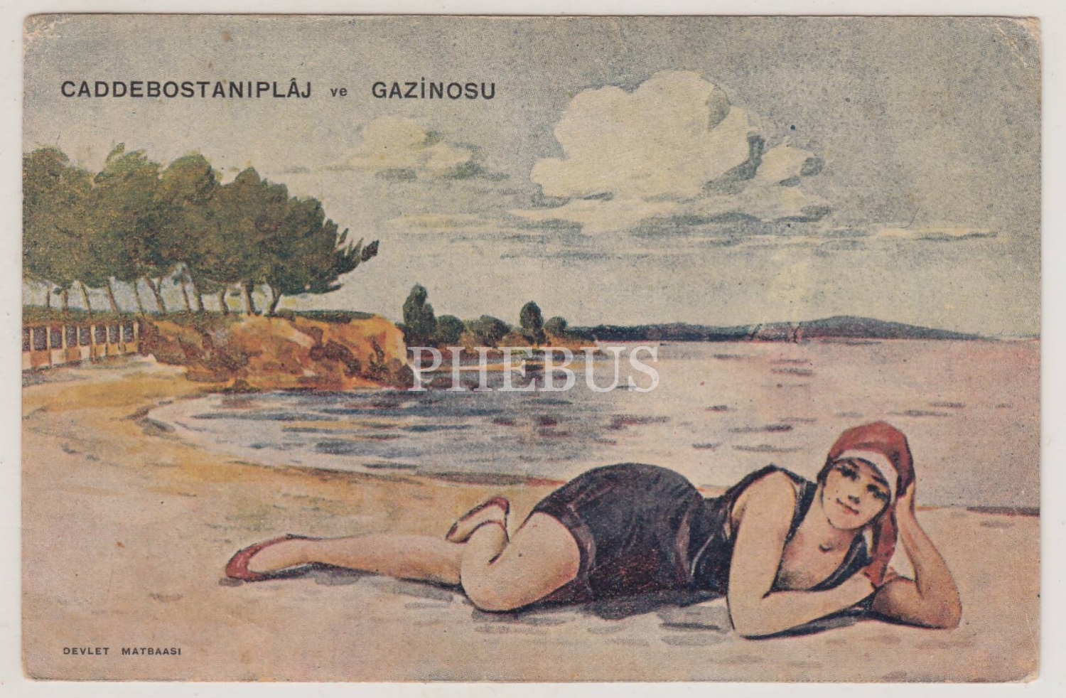 Caddebostanı Plaj ve Gazinosu görselli, Devlet Matbaası tarafından basılmış kartpostal...