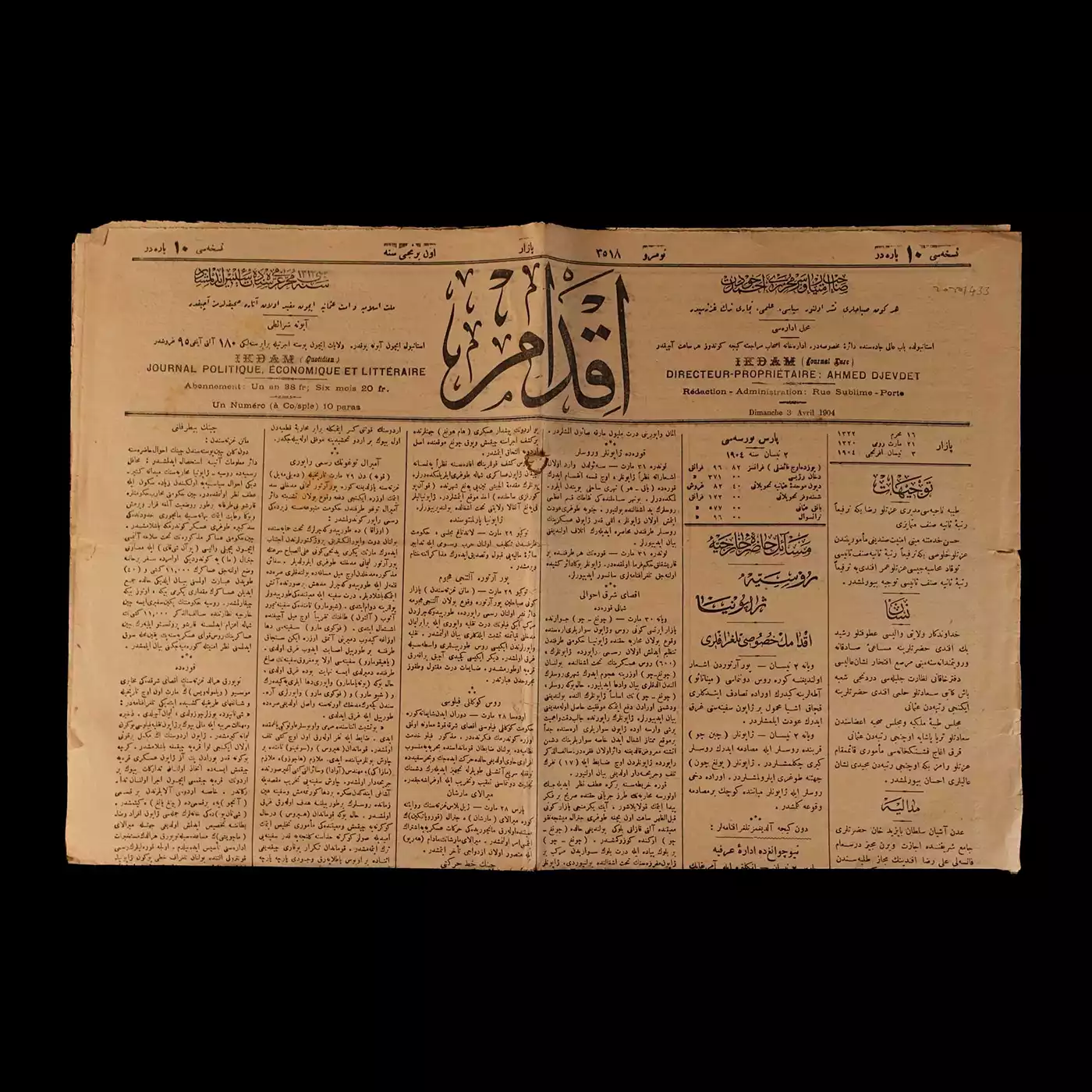 İKDAM gazetesinin 3 Nisan 1904 tarihli nüshası, 4 sayfa, 46x61 cm...