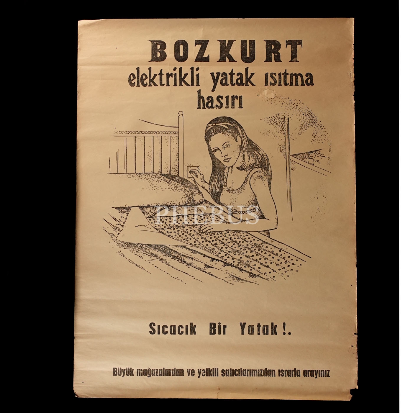 "Bozkurt Elektrikli Yatak Isıtma Hasırı - Sıcacık Bir Yatak!" yazılı reklam afişi, 50x67 cm...