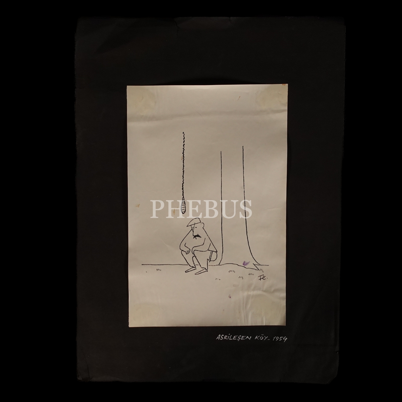 Karikatürist Ferruh Doğan´ın "Asrîleşen Köy - 1954" adlı karikatür sergisinin ıslak imzalı, çizim afişi, 20x30 cm, paspartu 32x45 cm...