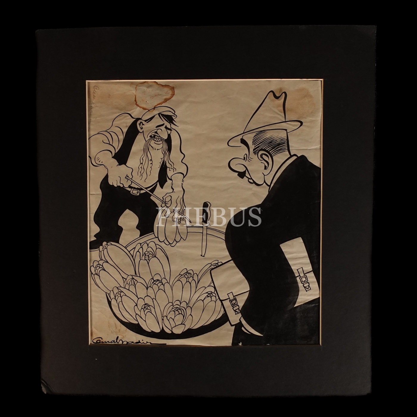 Cemal Nadir´den, kâğıt üzerine çini mürekkebiyle çizilmiş, imzalı, orijinal karikatür, çizim 22x26 cm, paspartu 33x36 cm...