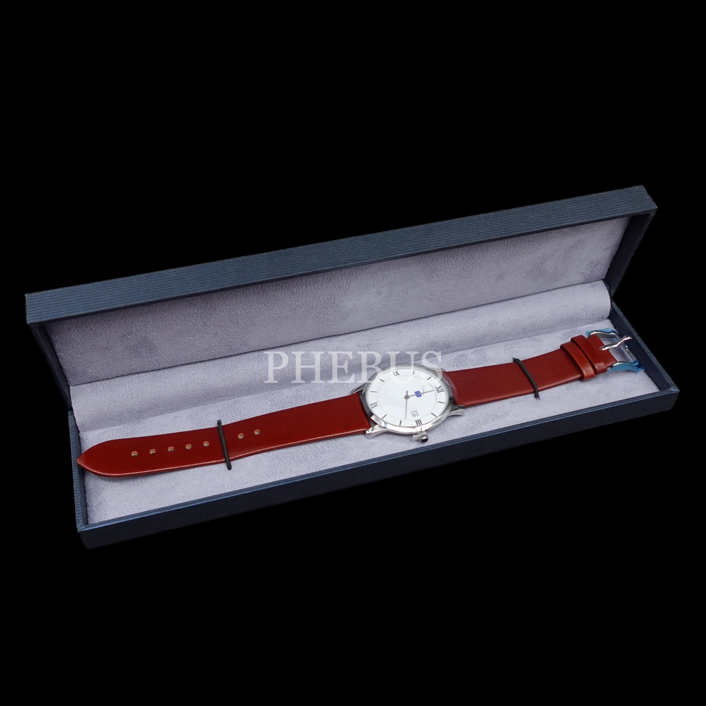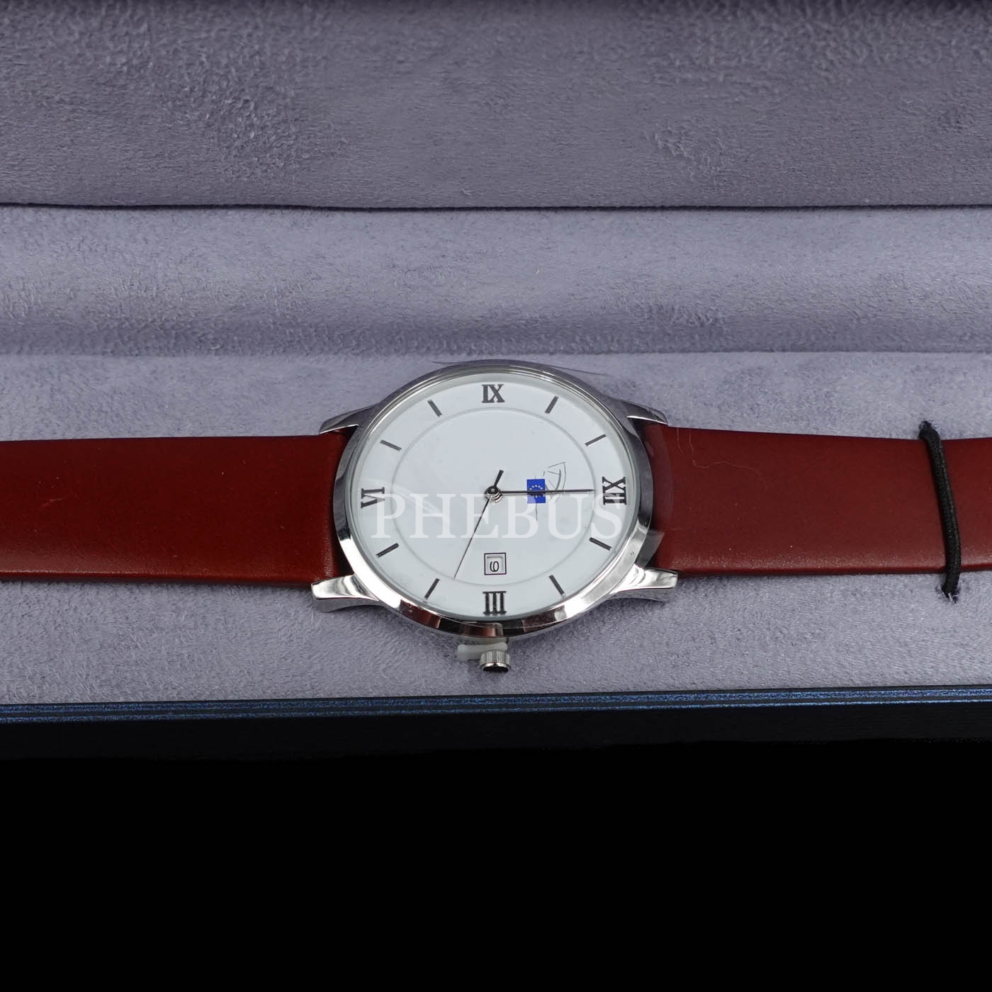 Orijinal kutusunda, kadranı Avrupa Birliği bayraklı, deri kayışlı kol saati, 23x4 cm...