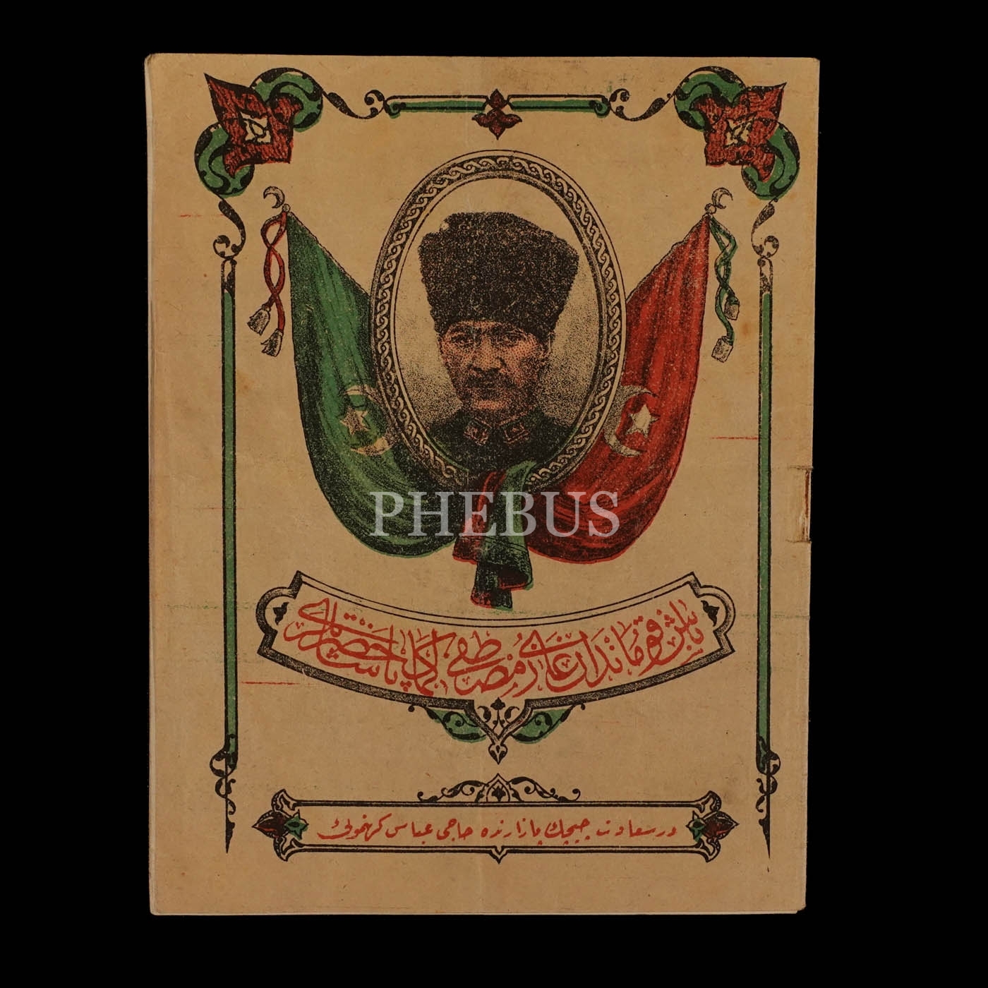 Ön kapağı Osmanlıca "Başkumandan Gazi Mustafa Kemal Paşa Hazretleri" yazılı ve Atatürk görselli, arka kapağı elinde "İleri" yazılı bayrak tutan asker görselli mektep defteri, 15x20 cm...