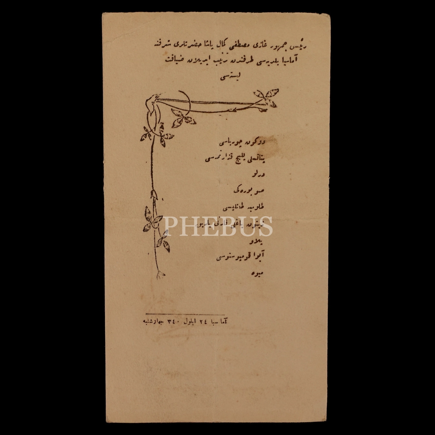 Mustafa Kemal Atatürk´ün 24 Eylül 1924 tarihinde Amasya´ya gerçekleştirdiği ziyaretinin şerefine, Amasya Belediyesi tarafından düzenlenen yemeğin menüsü, 12x21 cm...