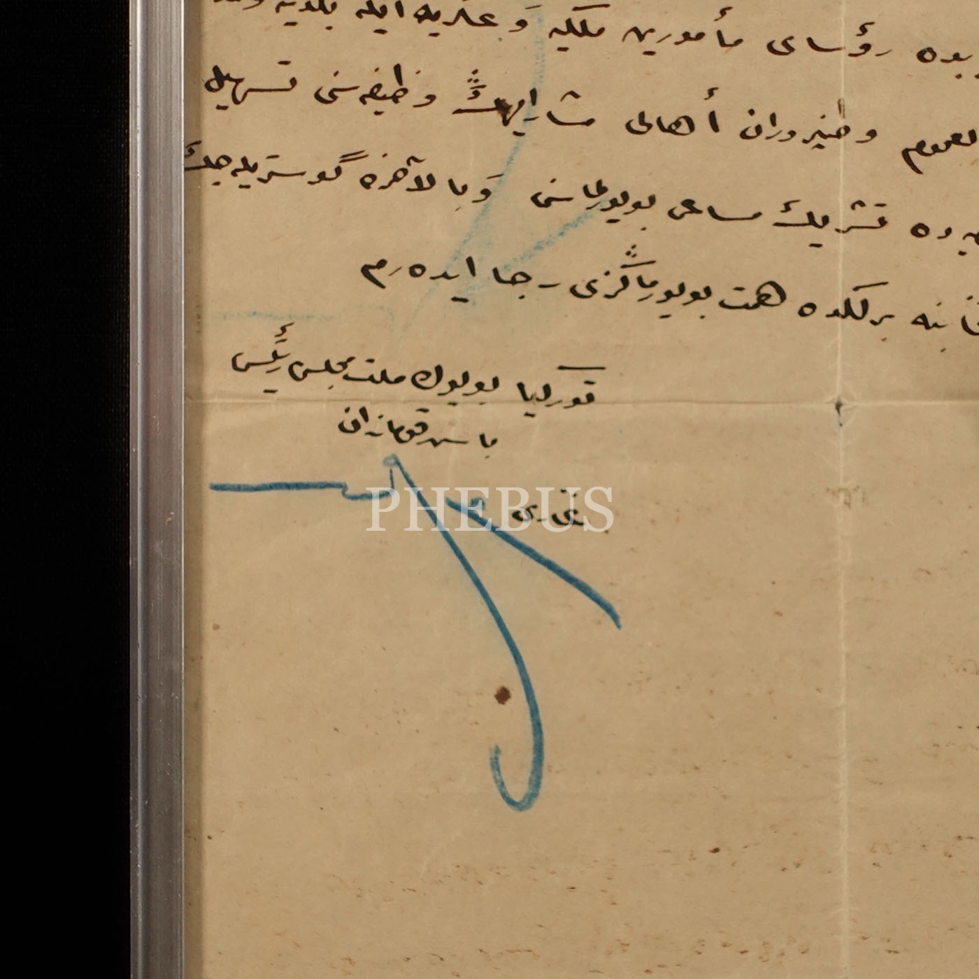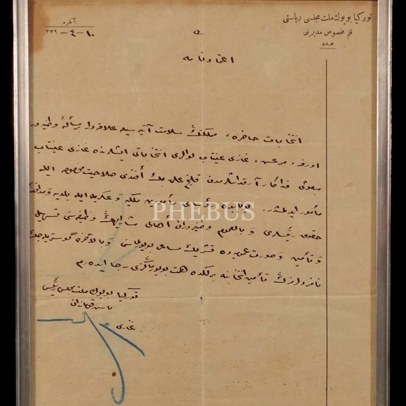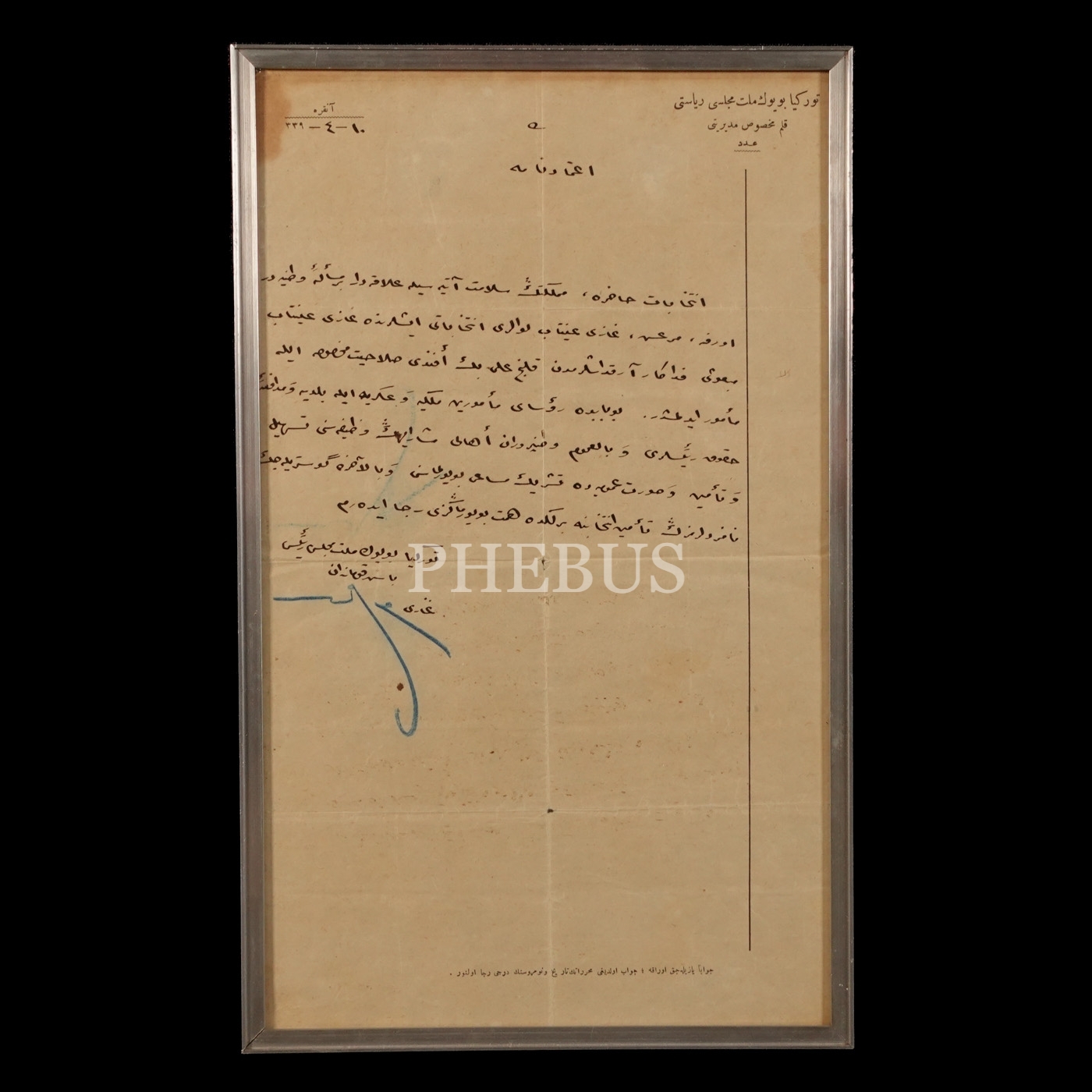 Şanlıurfa, Kahramanmaraş ve Gaziantep bölgesinde gerçekleştirilecek milletvekili seçimlerinde, Gaziantep Mebusu Kılıç Ali Bey´in memur tayin edildiğini beyan eden, Mustafa Kemal Atatürk´ün ıslak imzasını taşıyan itimatname, 10 Nisan 1339, çerçevesiyle birlikte 21x35 cm...