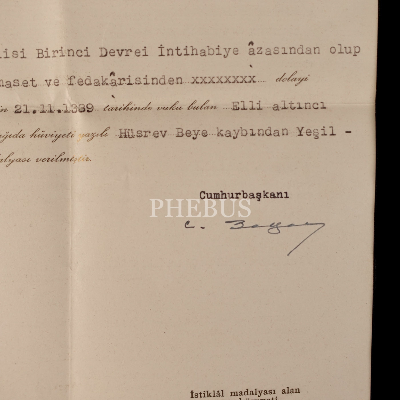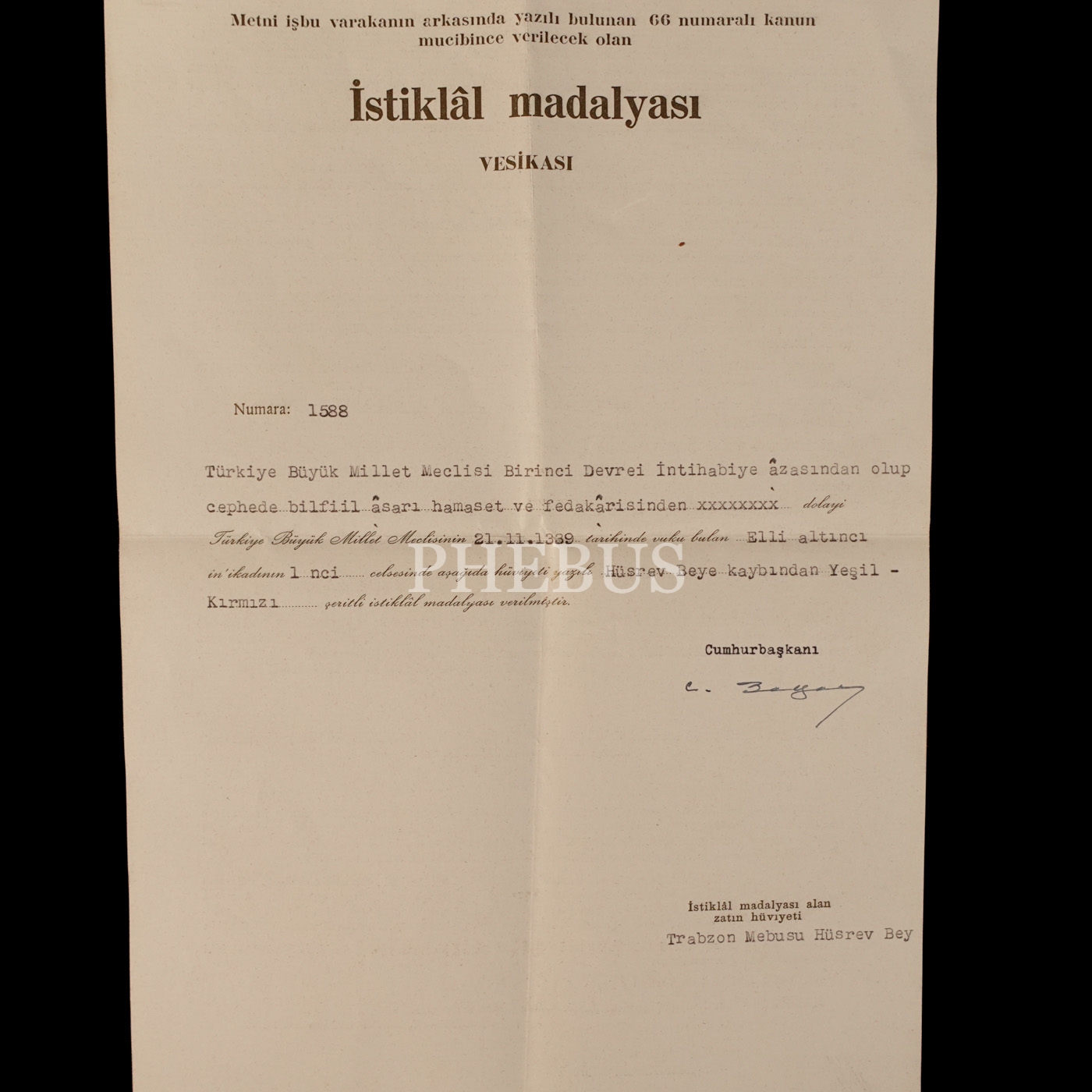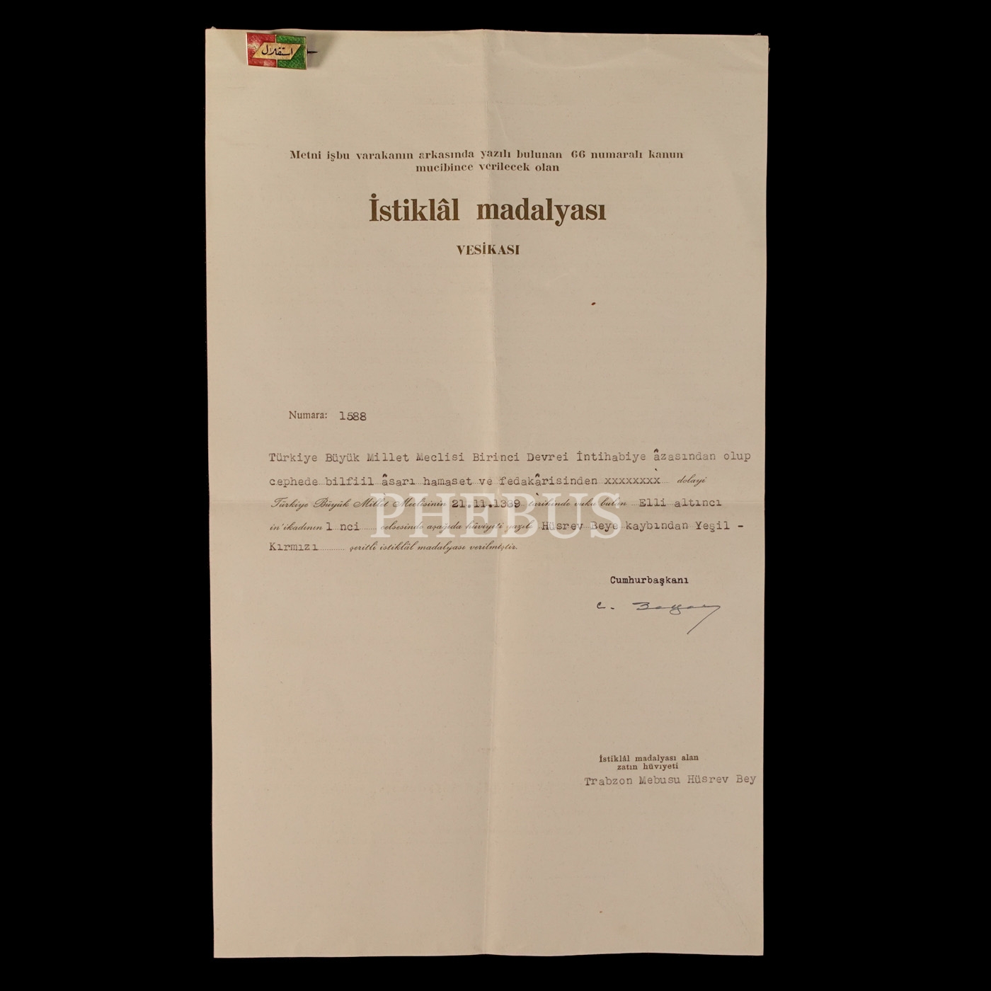 Trabzon Mebusu Hüsrev (Gerede) Bey´e ait Yeşil-Kırmızı İstiklâl Madalyası, madalyanın dönemin Cumhurbaşkanı Celal Bayar´ın ıslak imzasını taşıyan vesikası ve Hüsrev Bey´in Viyana´da bulunan "KNOZER" Fotoğrafhanesi´nde aldırdığı hatıra fotoğrafı...