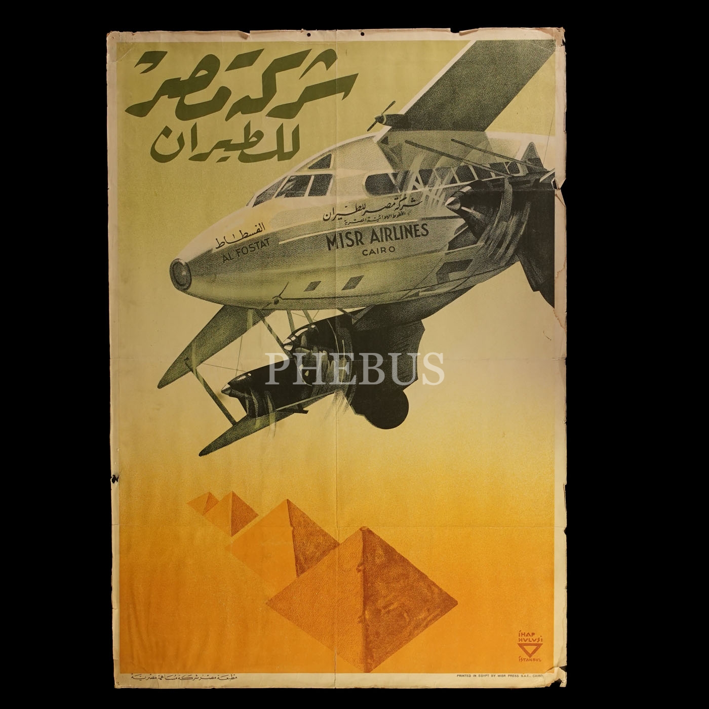 İhap Hulusi tasarımlı Mısır Havayolları afişi: "Mısr Airlines", Printed in Egypt by Mısr Press S.A.E., Cairo, 69x99 cm...