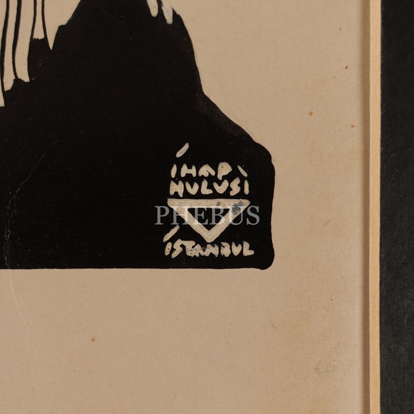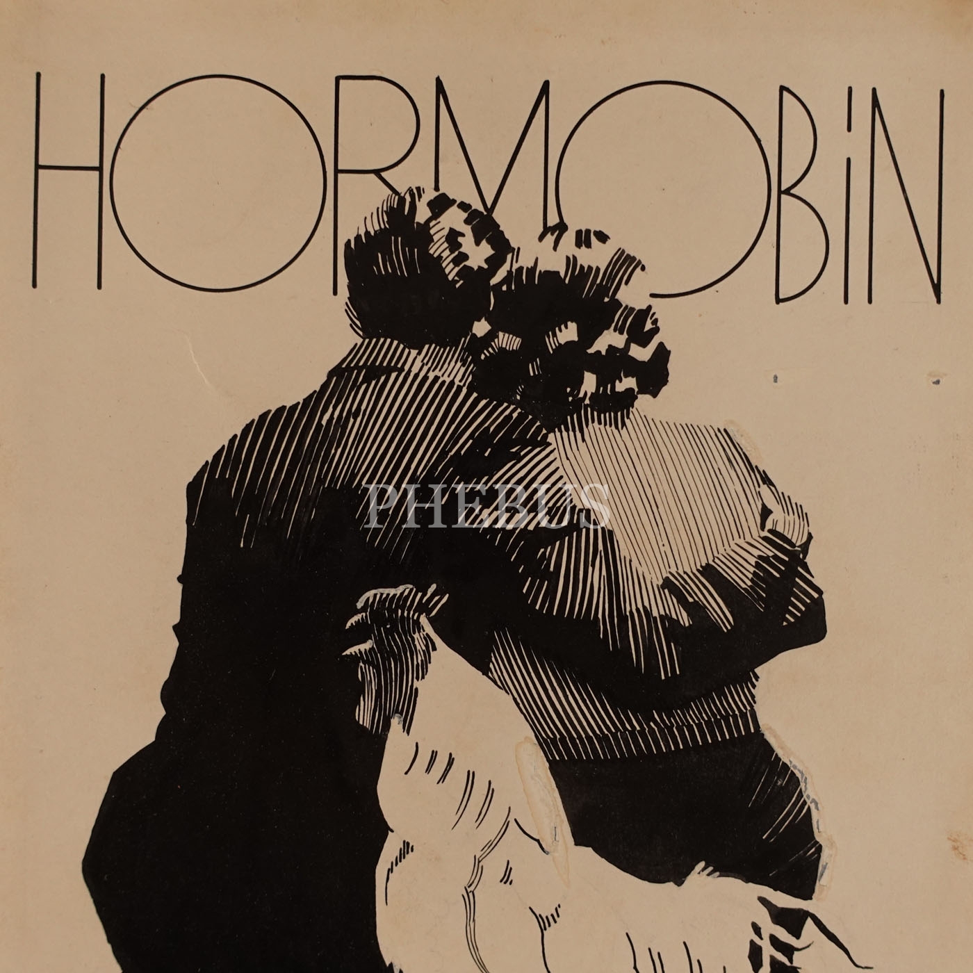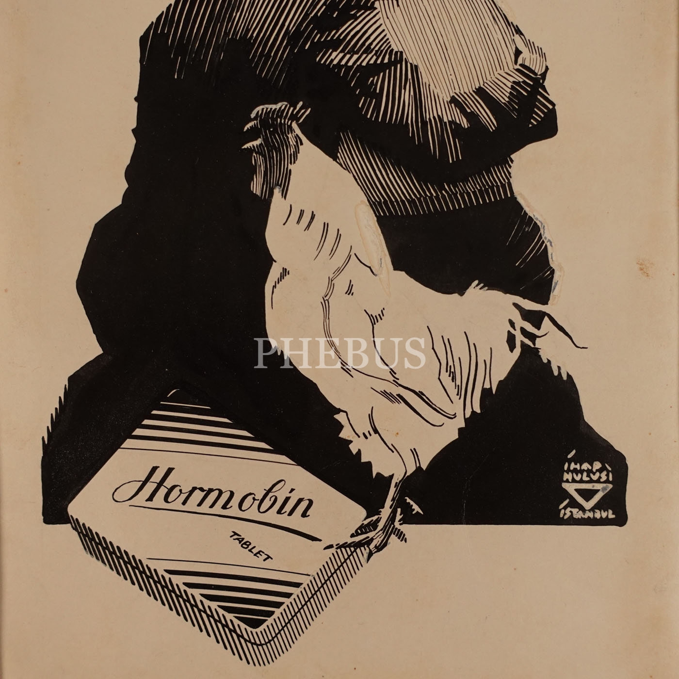 İhap Hulusi´den ıslak imzalı, kâğıt üzeri çini mürekkebi orijinal reklam çizimi: "Hormobin Tablet", 29x37 cm...