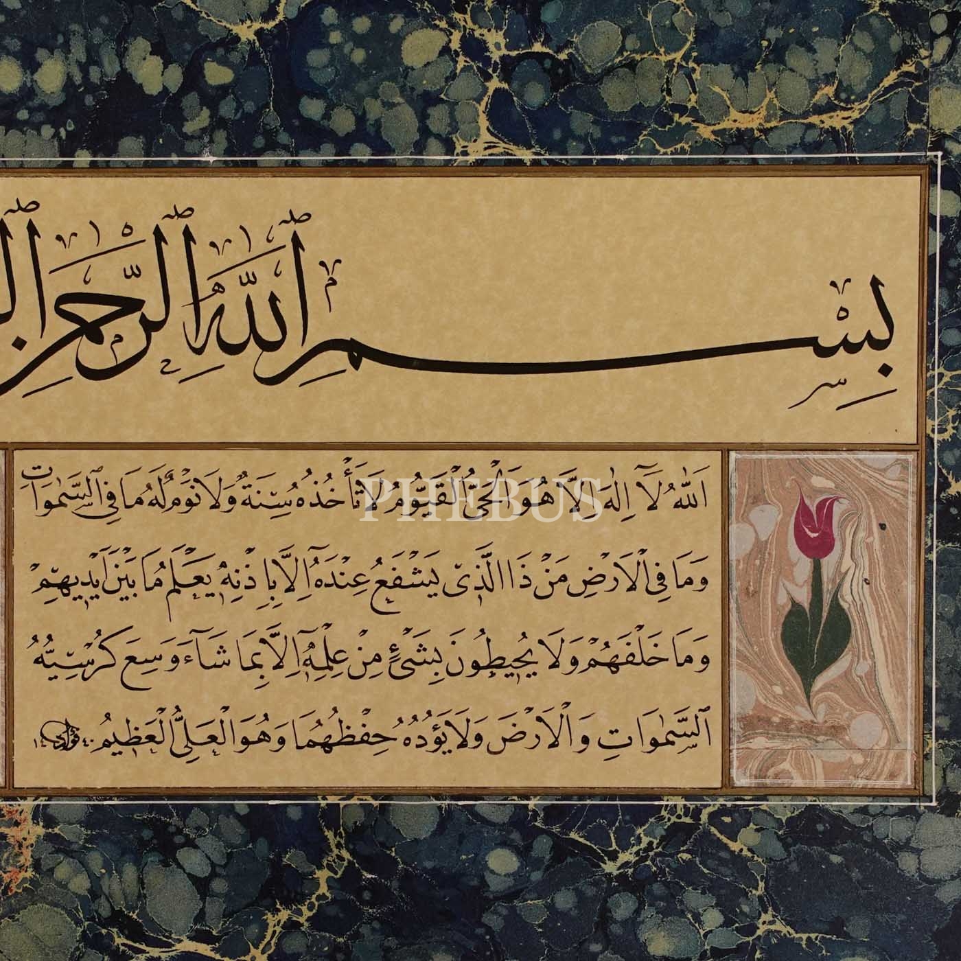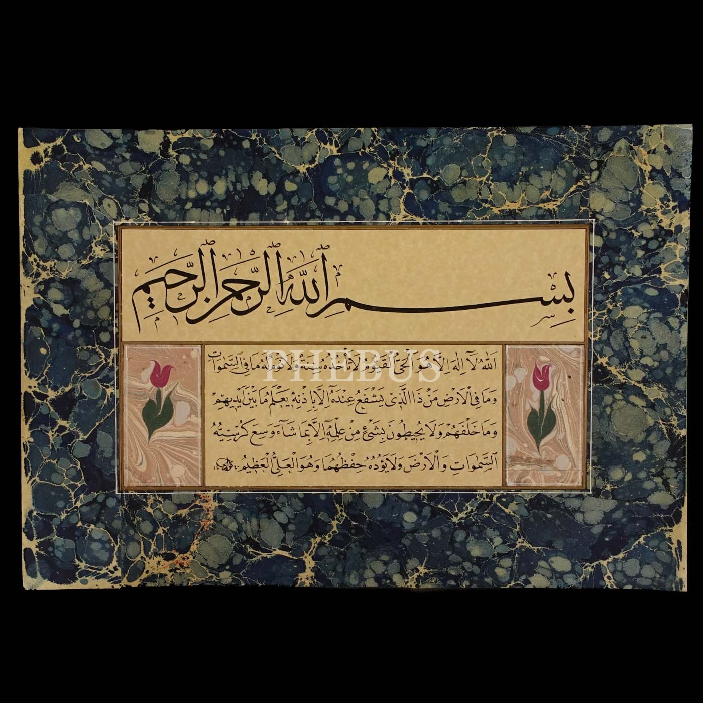 Fuad (Başar) ketebeli, sülüs oklu Besmele-i Şerif ve nesih Ayet-el Kürsi levha, 1440, 41x28 cm...