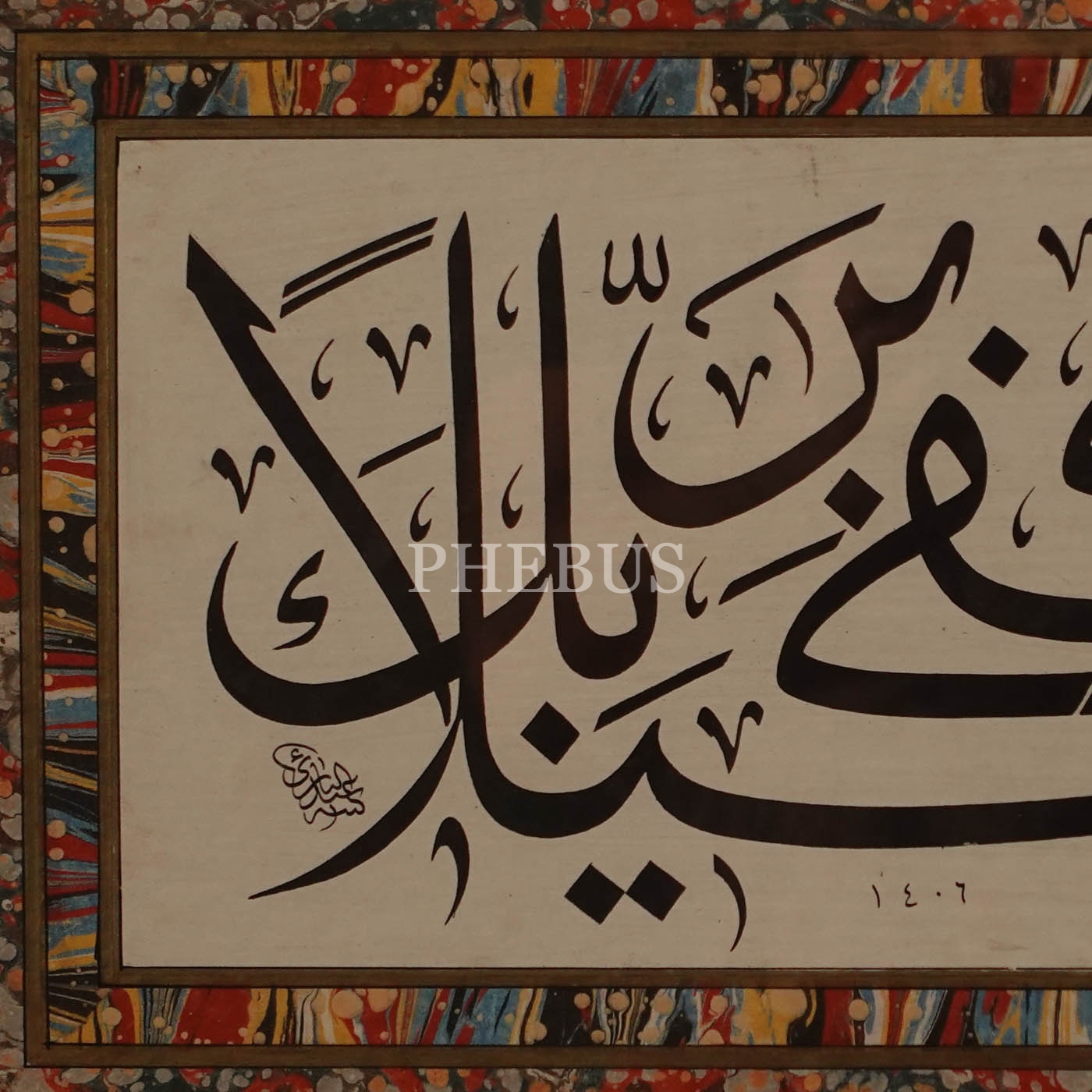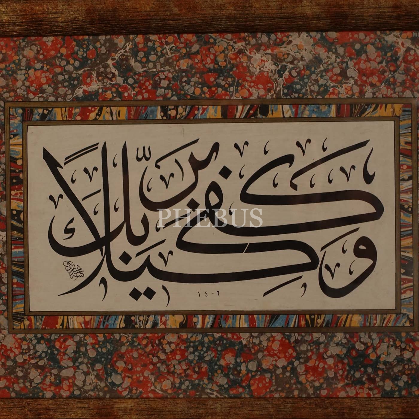 Abdülbâri (Talip Mert) ketebeli, celi sülüs Ayet-i Kerime, 1406, ebru pervazlı, çerçevesiyle birlikte 56x41 cm...