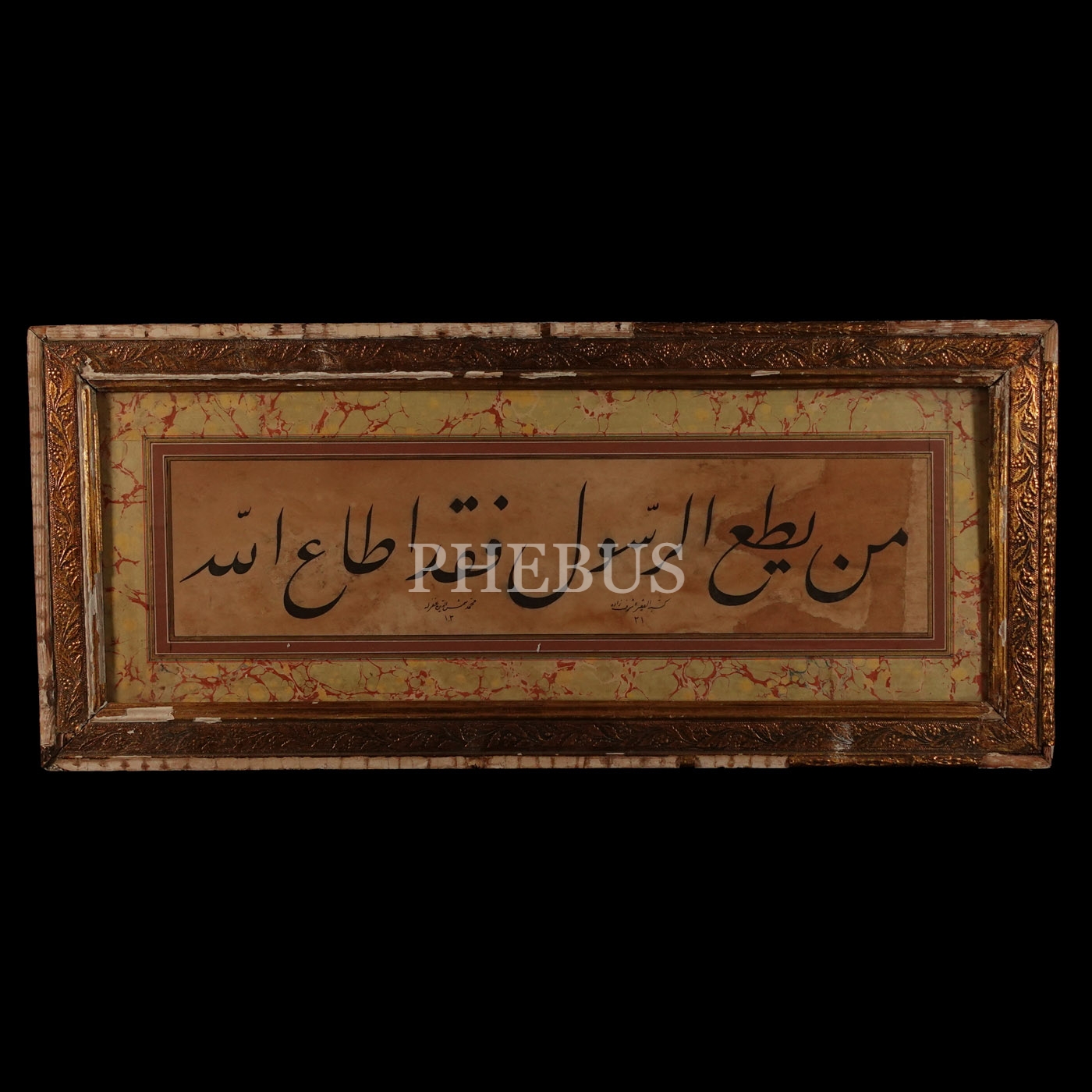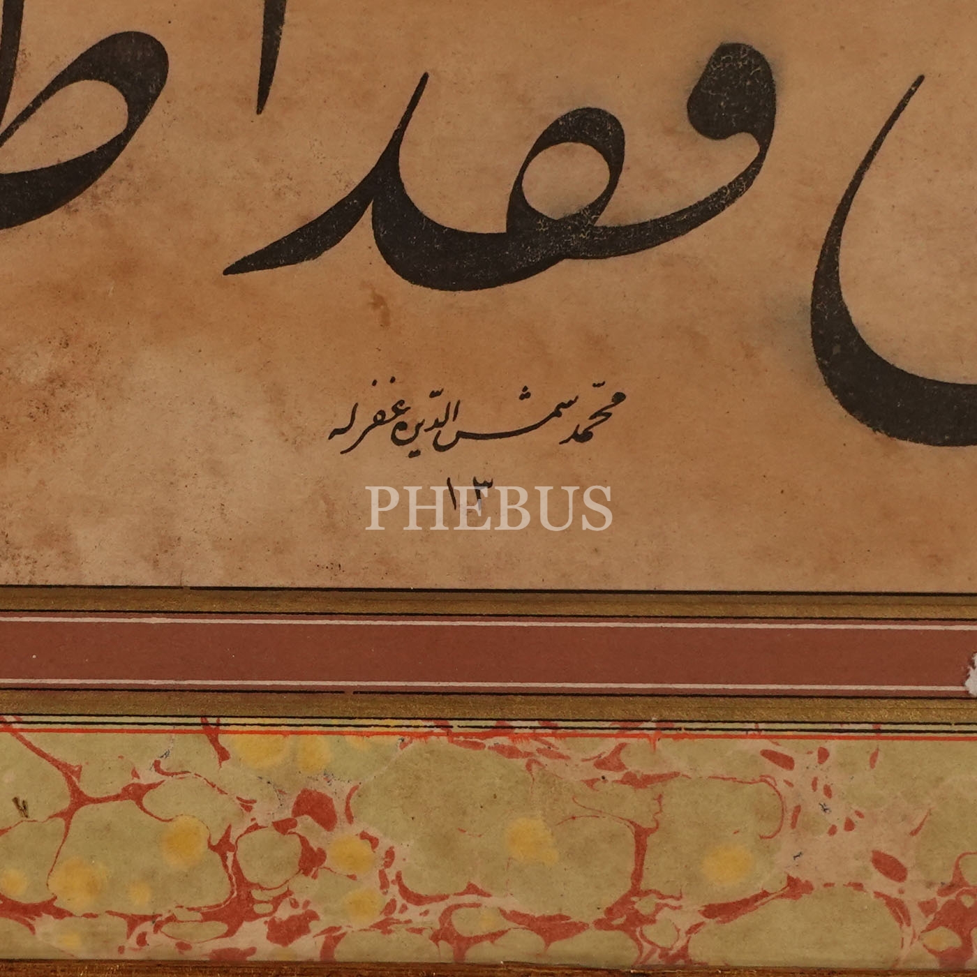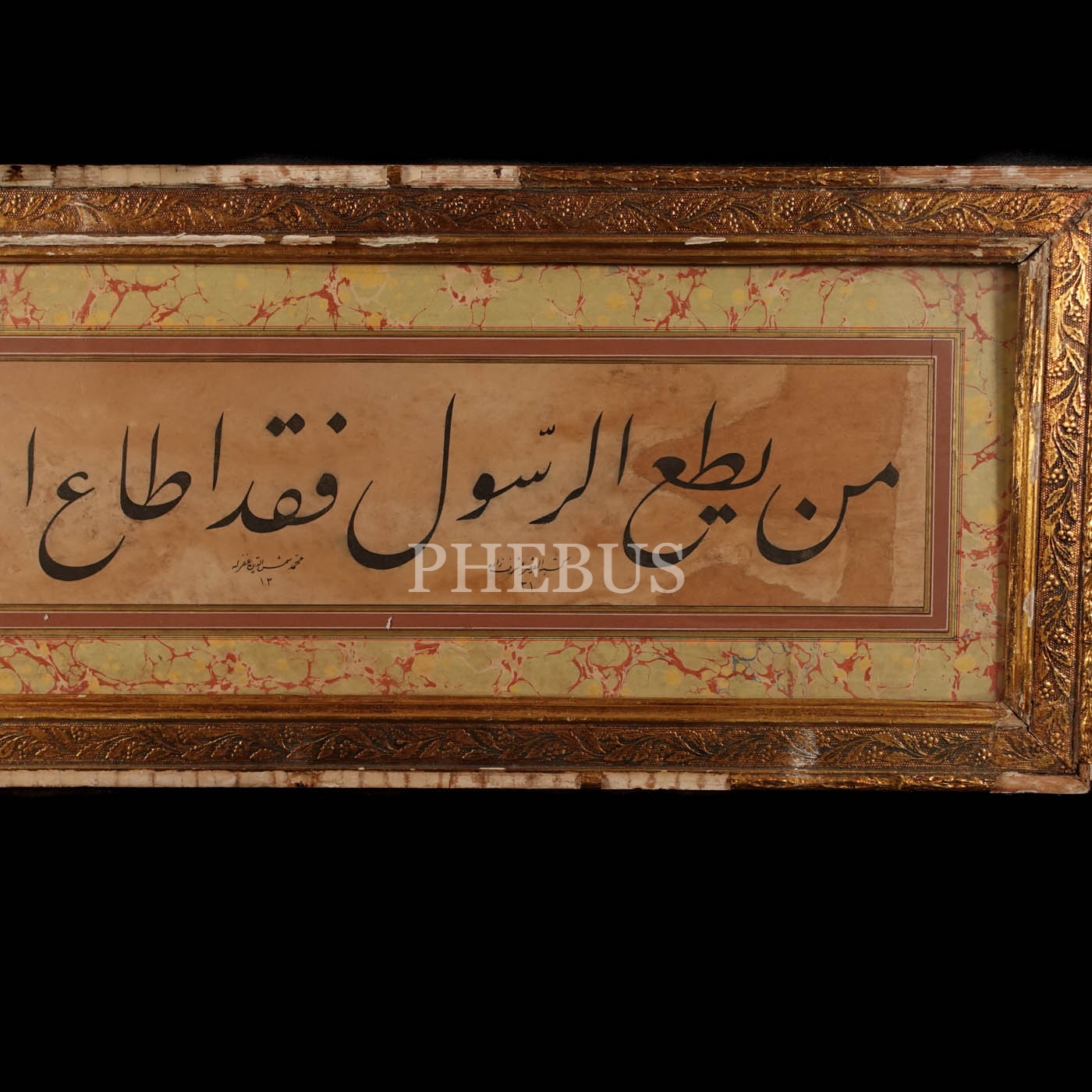 Eşrefzade Mehmed Şemseddin ketebeli, ta´lik Ayet-i Kerime, 1331, ebru pervazlı, çerçevesiyle birlikte 73x33 cm...