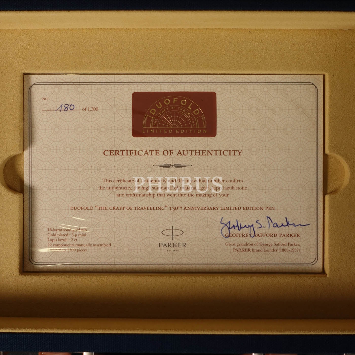 Parker markasının kurucusu George Safford Parker´ın torunu Geoffrey Safford Parker´ın ıslak imzasını taşıyan sertifikasının da yer aldığı orijinal çantasında sınırlı üretim (180/1300) Parker Duofold 2018 dolma kalem, 18K altın uç, çanta 31x20x10, kalem 14 cm...