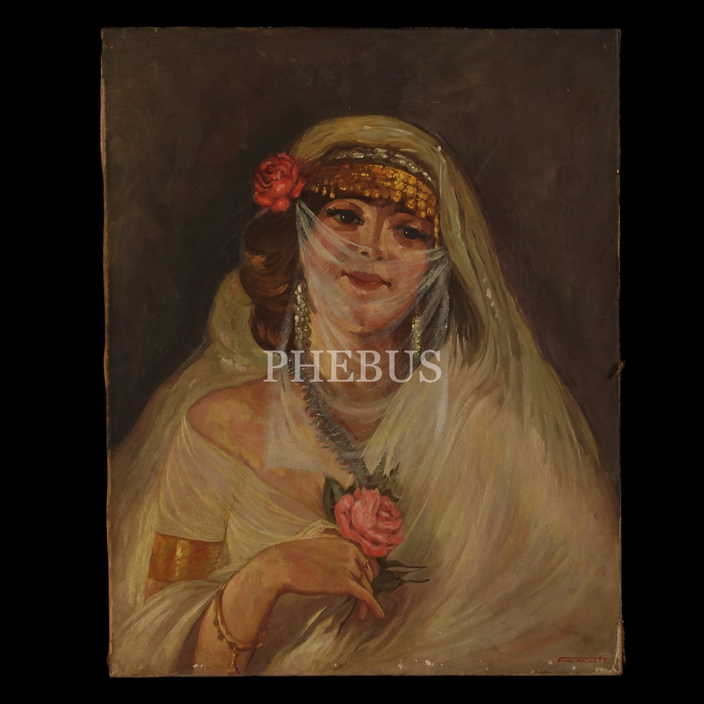 Karikatürist Faruk Alpkurt´un çok nadir görülen yağlı boya tablolarından biri, çiçekli Türk kızı, 40x51 cm...